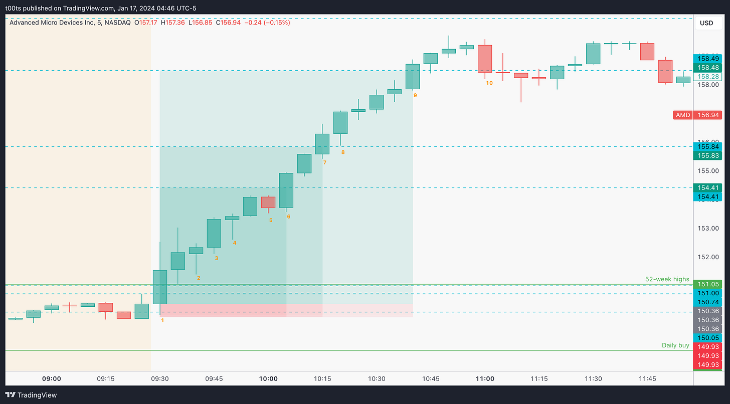 Bar 1 was our entry. Right when price reclaimed the opening print. The trade works immediately and the bar makes new 52-week highs and closes above the $151 cluttered area.