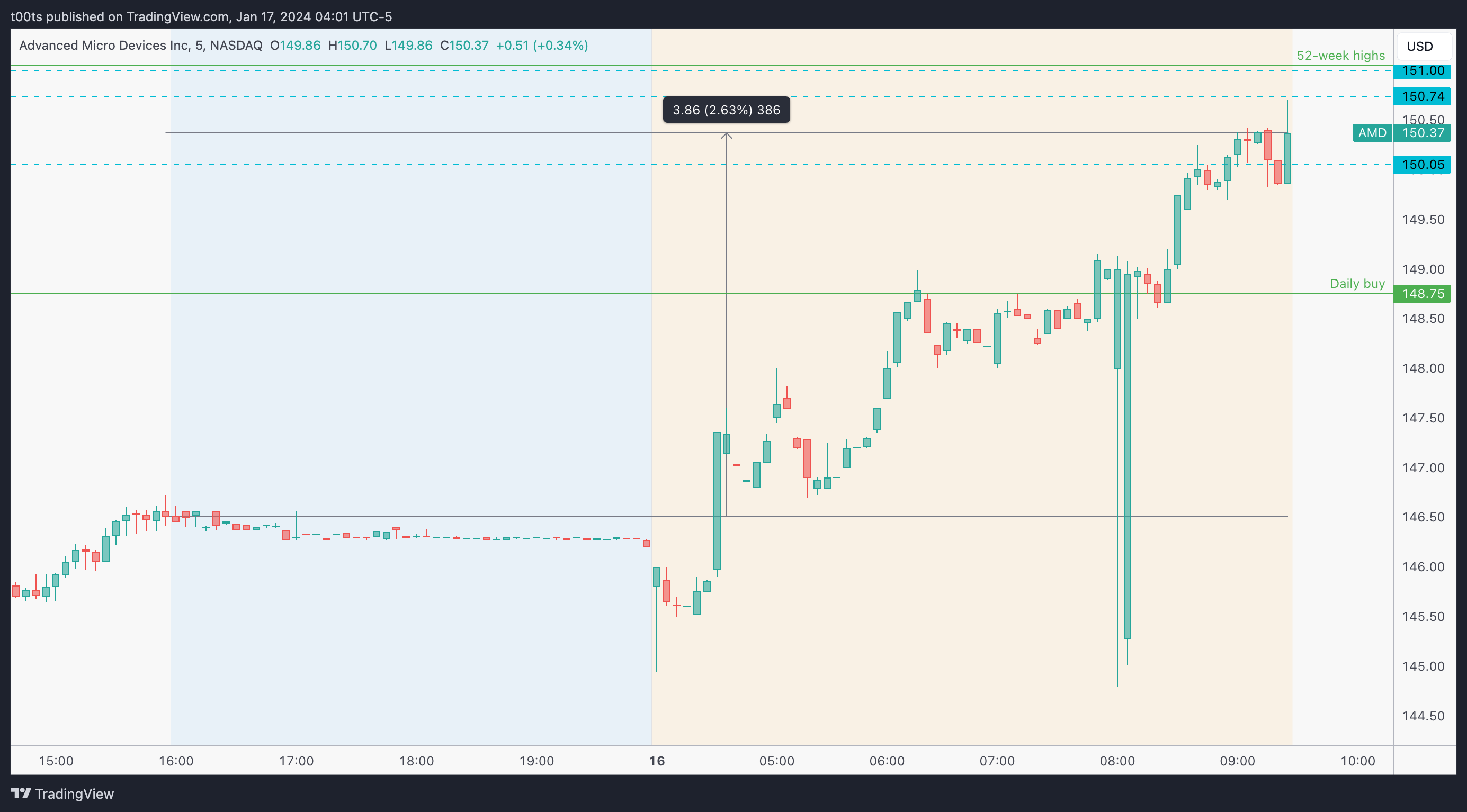 This is what caught my attention and essentially made AMD my top watch for the day. Absolutely killer pre-market move, setting up for a breakout of the crowded area we just talked about. Notice price is already above the $150 psychological level we discussed, hence why my gameplan called for bounces at this level targeting the first major level above the $151 area, which is $154.41.
