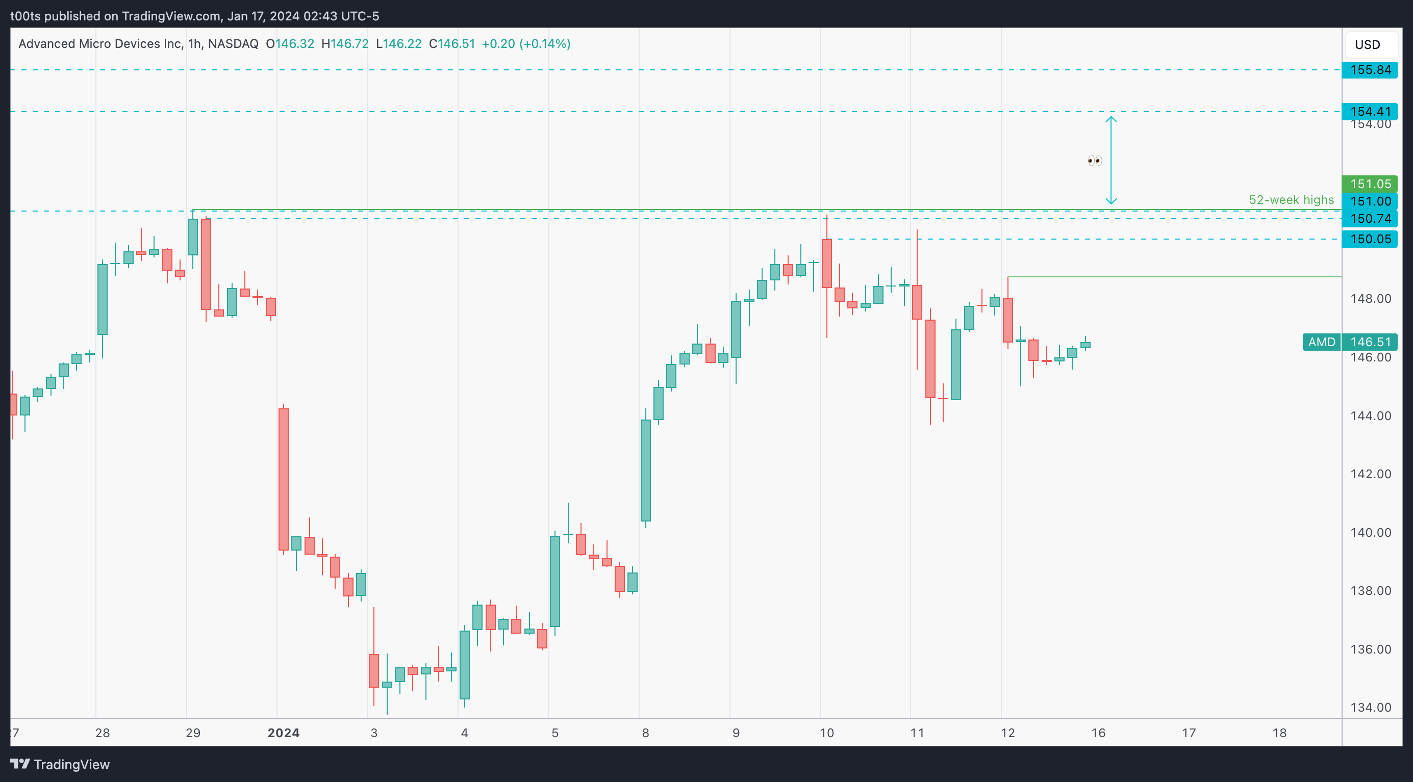 Hourly chart looks great too, but a bit crowded level-wise until $151, which not surprisingly matches the 52-week highs we put in the last day of 2023. Keep in mind that we also have a level at $150.05, very close to the $150 big round number, which makes it a huge psychological level. It won't go unnoticed.