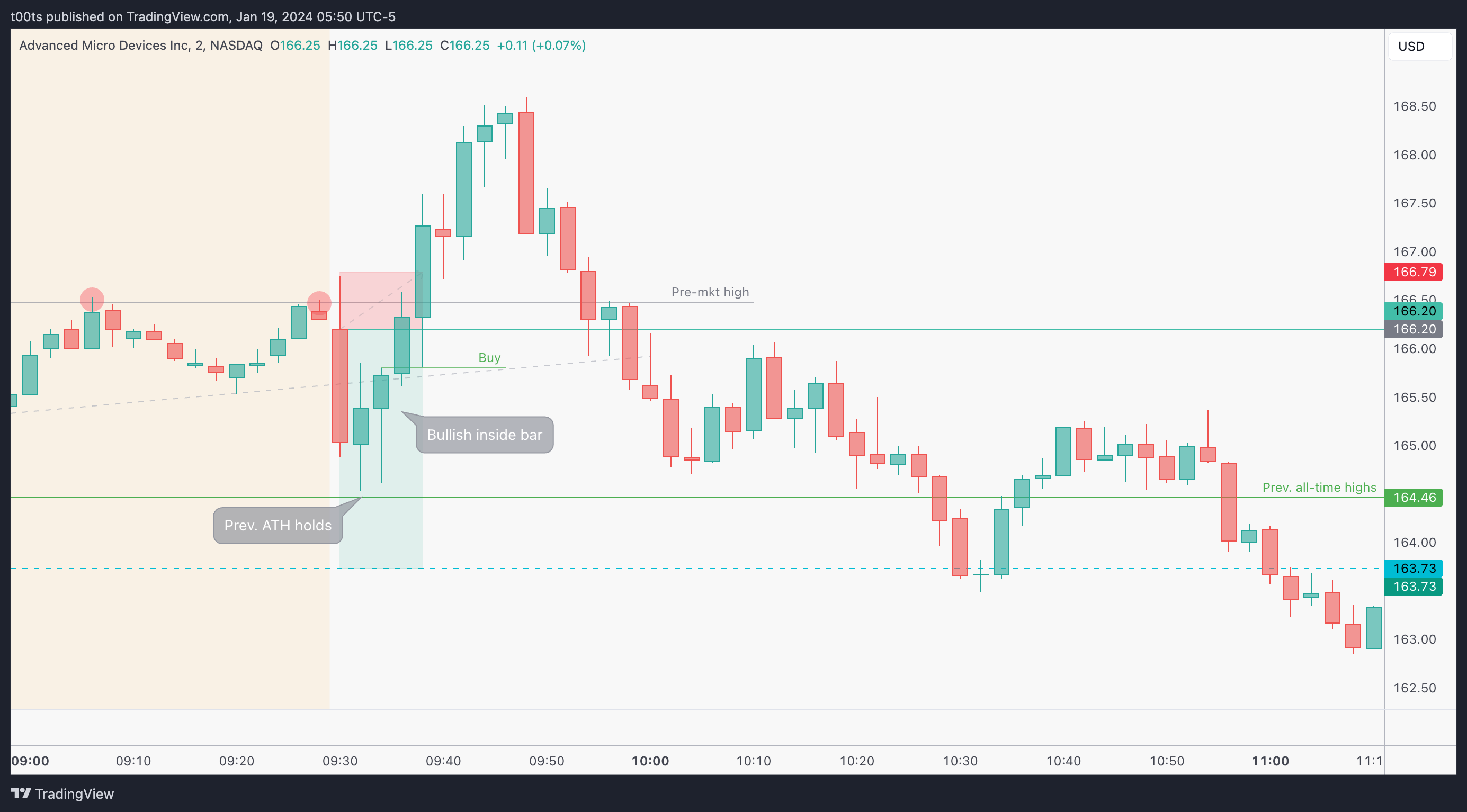 For context, I'm sitting long in ARM (will review this one later this week) and it's starting to range. I notice the strong pullback on AMD. They're obviously correlated as they belong to the same sector. So, while I start keeping a close eye on my ARM long for a potential pullback, I notice a beautiful 2m buy setup forming right at the opening print on AMD. This 2m buy has formed off a 2m double bottom and looks good for both longs and shorts. Longs would keep the momentum going, shorts would break this 2m double bottom triggering short-term trader stops and potentially open the door for a trend below the opening print.