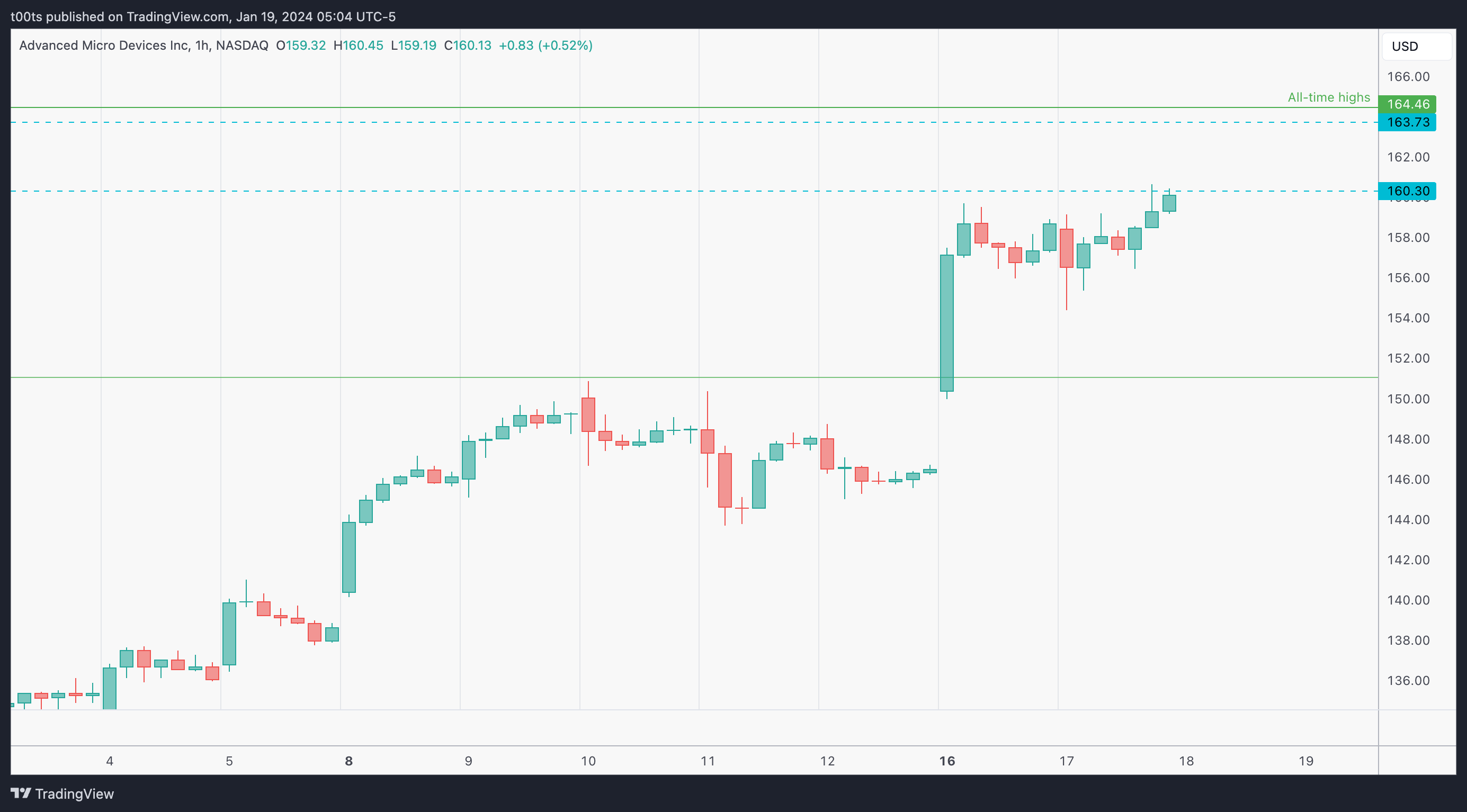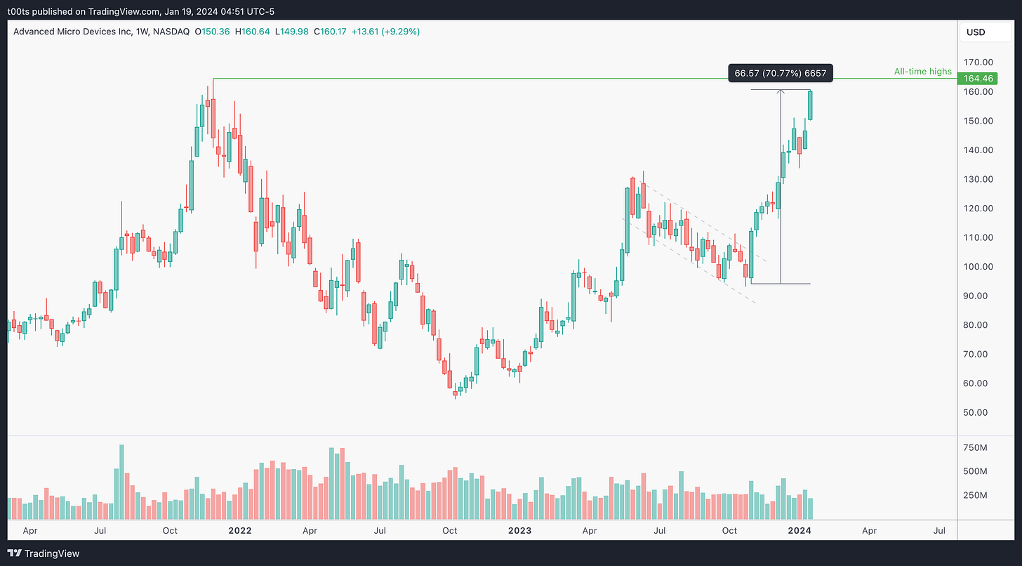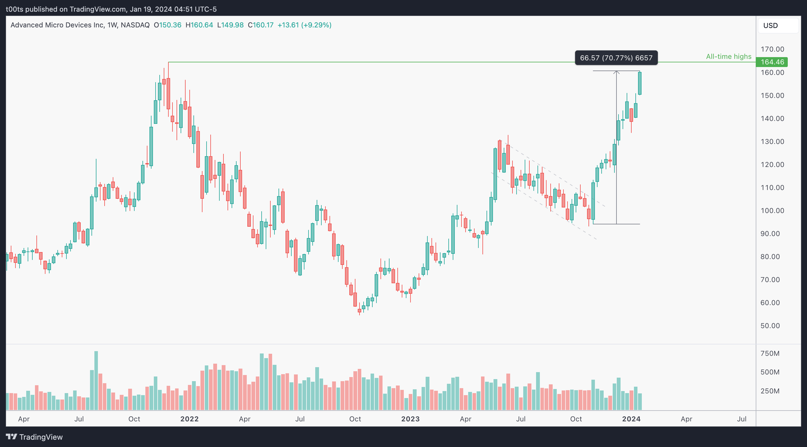 AMD and the whole semiconductor industry have been leading the market for the past few months. The recent $500 breakout on NVDA has been pushing the semis even further. AMD seems to have no breaks as it paves its way into prices we haven’t seen since late 2021.