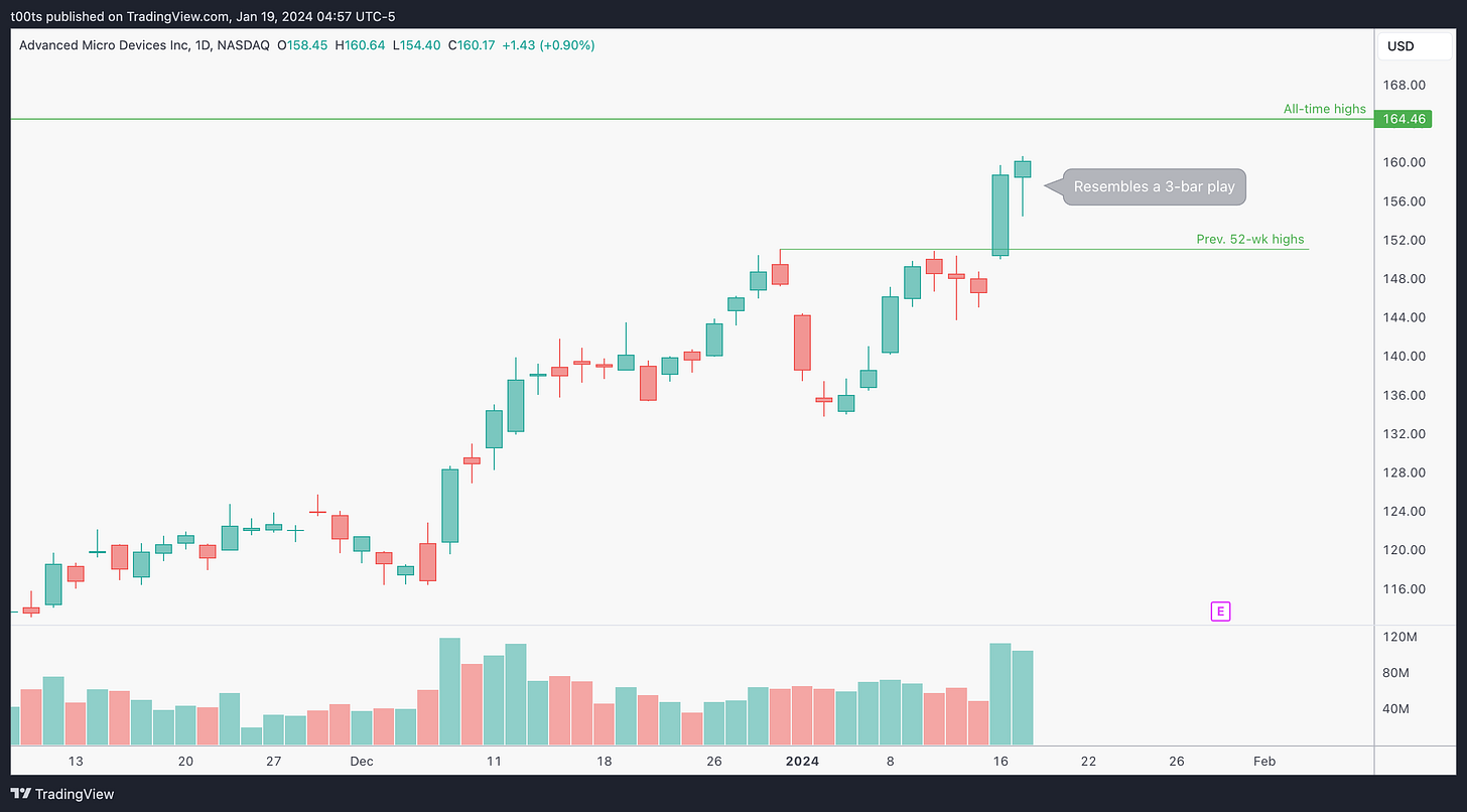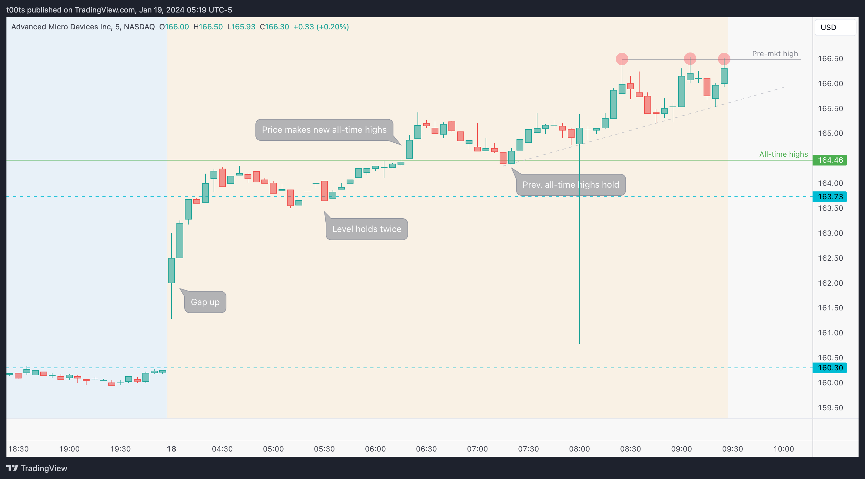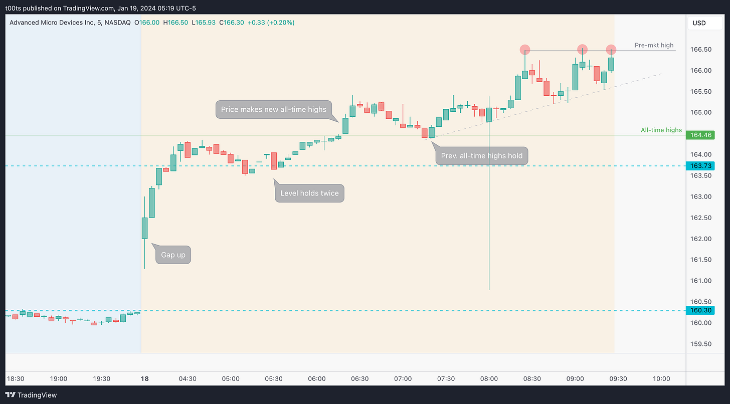 As we can see on the chart below, AMD is already making new all-time highs, showing a super healthy uptrend after gapping up at 4am. This doesn't go unnoticed to traders. There will for sure be a lot of eyes on this name today. Something I noticed was this triple top at pre-market highs going into the open.
