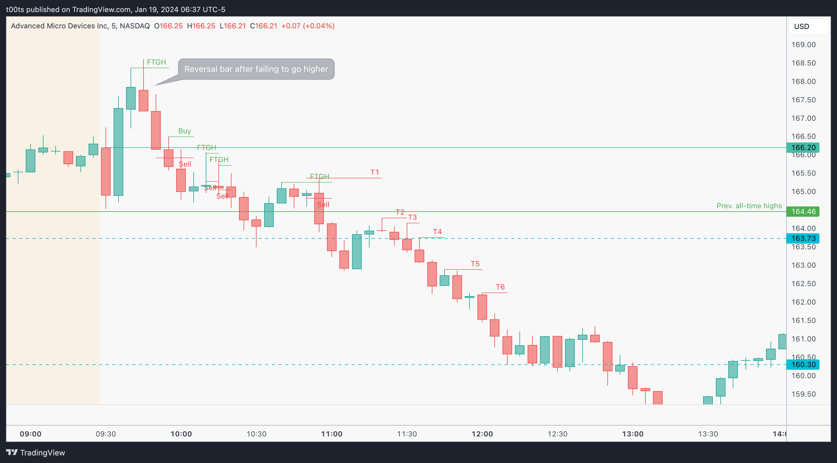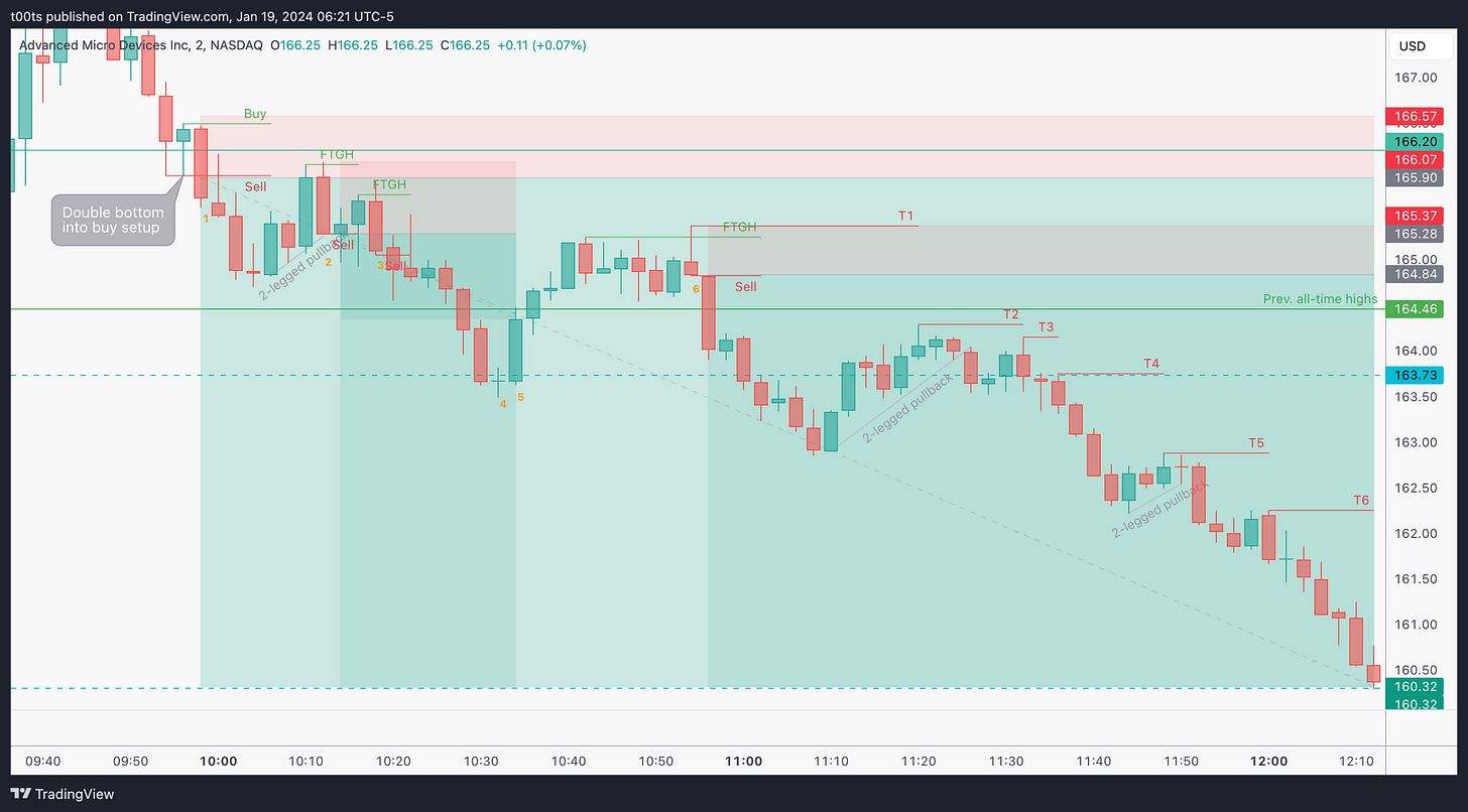 It's almost 10am. We’ve had a strong rejection at the highs, and the double bottom buy setup that's setting up fails. I jump in with a starter position risking the signal bar highs and essentially sit and wait for opportunities to add. I'm still long on ARM at this point, so the AMD short acts as a good hedge. Soon enough, I'd be out of ARM and focusing on this one. Let's go over this 2m chart bar by bar: