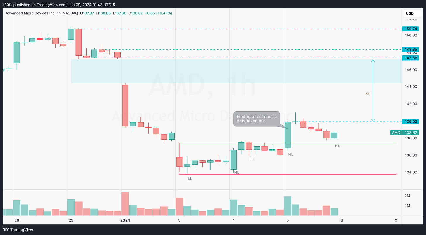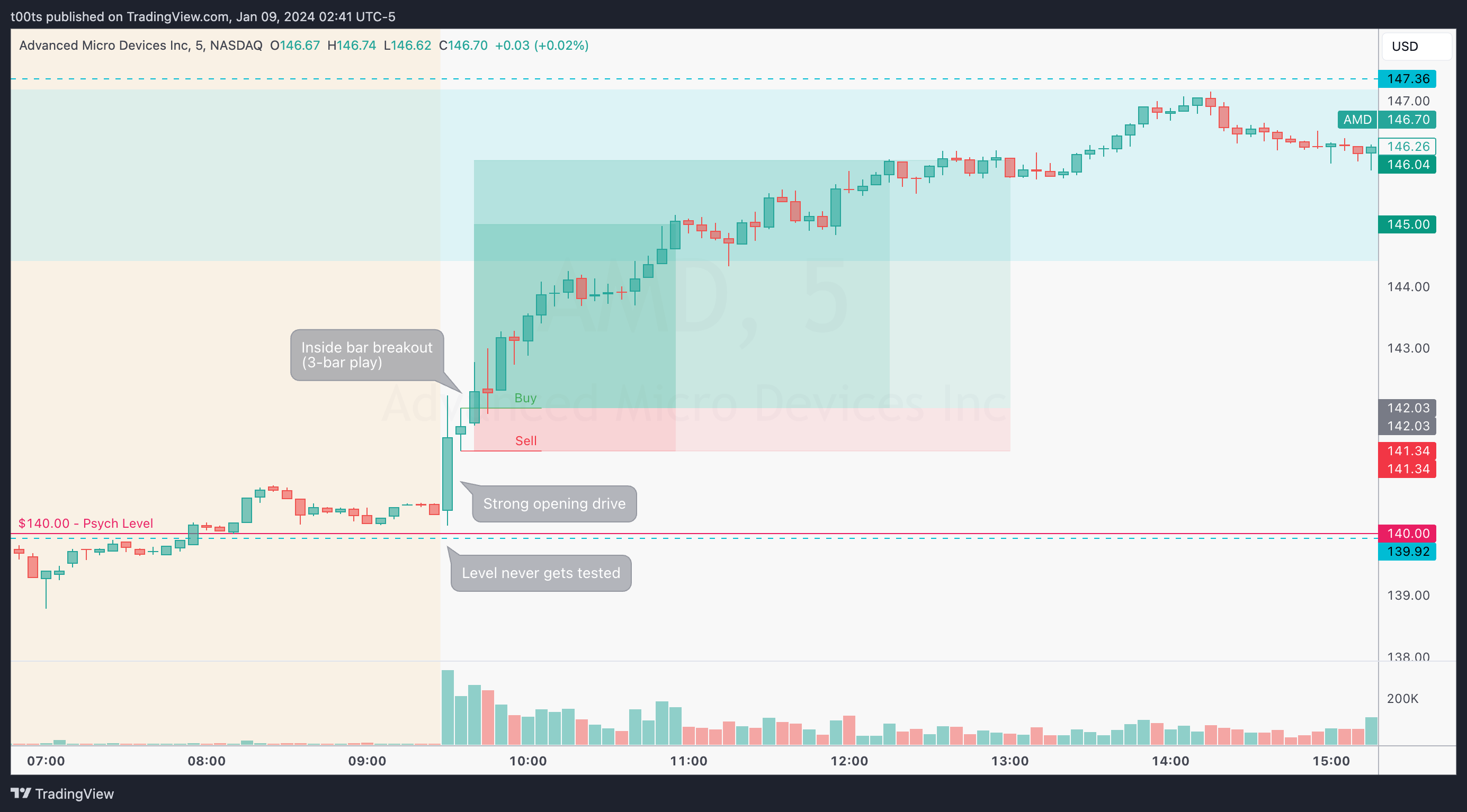 This was one of the easiest trades to hold I remember. The thing I liked most about this trade was how, despite not getting a test of a level right off the open, price action offered a solid entry early in the day that allowed for a great trade. Most eyes were on NVDA yesterday, which completely took off rallying 15pts straight off the open in the first 20 minutes of trading. That's hard to catch unless you've planned for it. AMD was a straightforward sympathy play that offered a good opportunity to capitalize on.