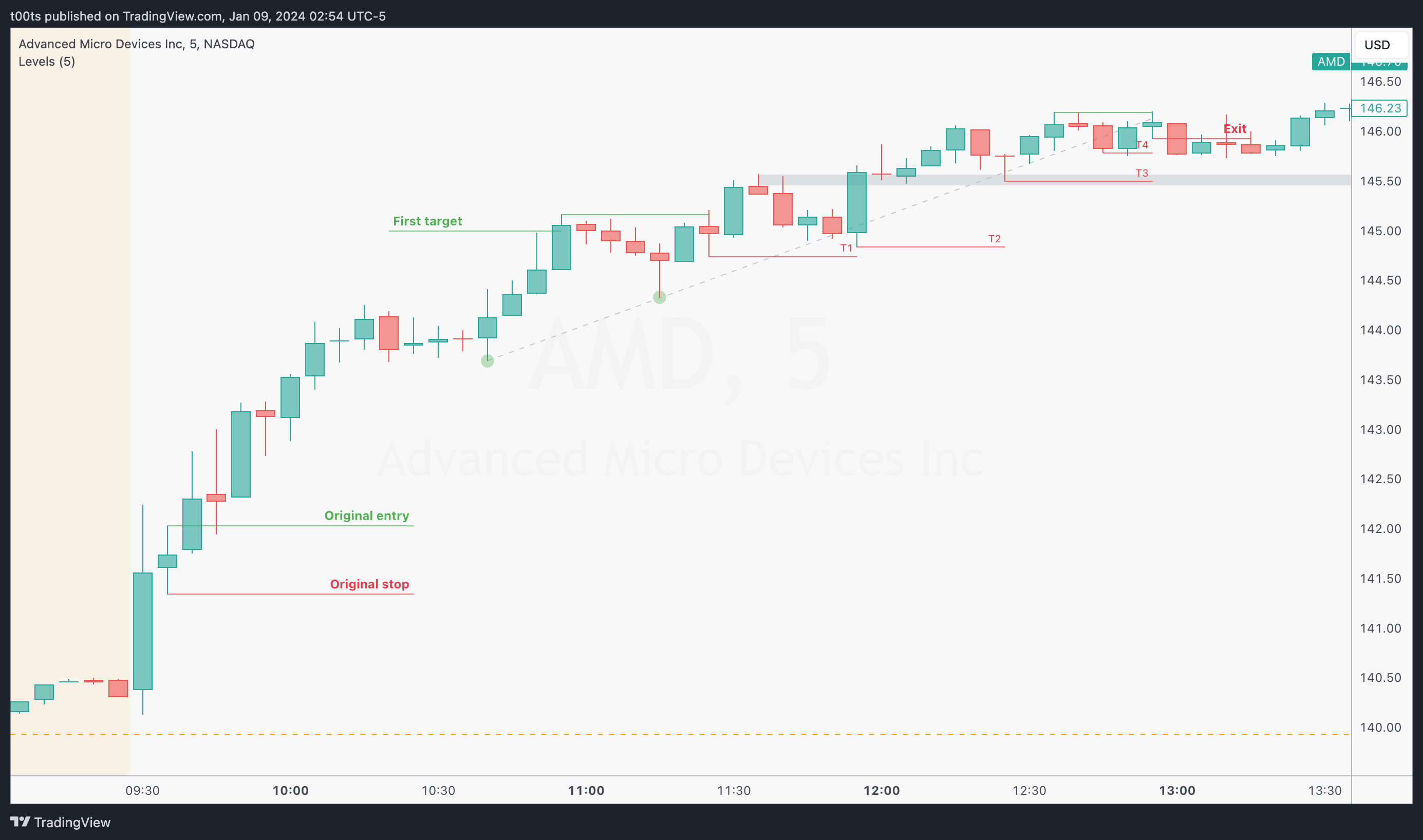 Personally, my first target was $145 psychological level. More often than not, these levels act both as magnets and as targets for many traders. I held a core until 1pm EST, where I finally closed the trade.