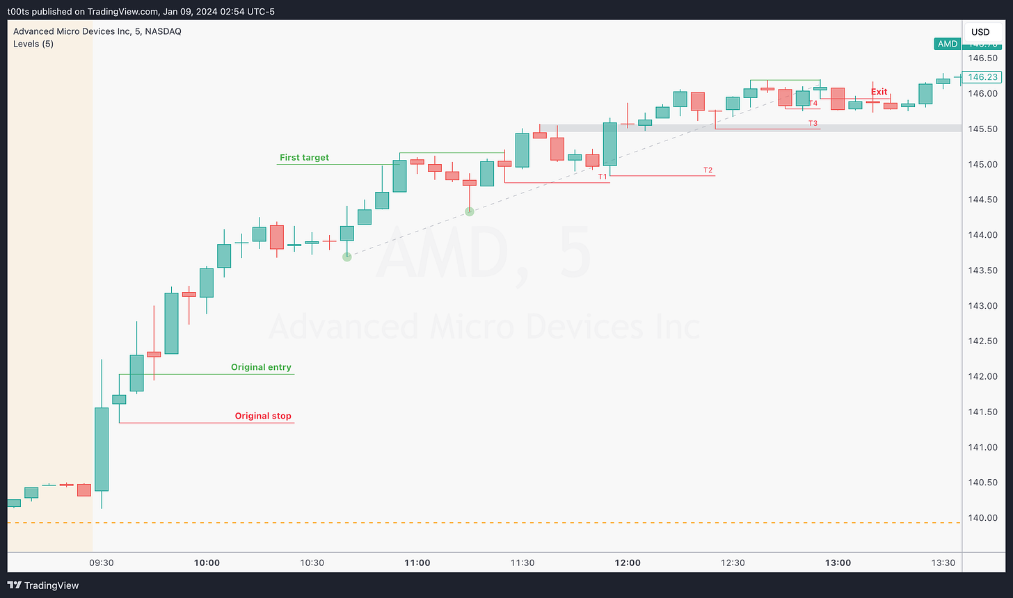 In hindsight, I failed to hold for that last move. But, as I posted on 𝕏, the trade was no longer worth holding for me. At that point the stock was starting to range and my risk-to-reward became too skewed. It just made more sense to lock it in.
