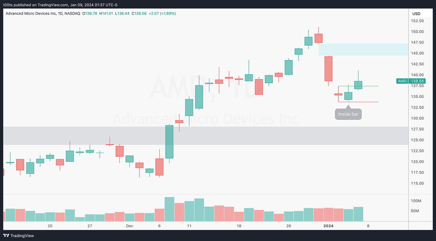 When we zoom into the daily chart, we notice a similar pattern to what we discussed last week when dissecting NVDA. After the sharp downturn, price ranged for a couple days and then broke out to the upside. The bar I've marked as inside bar is technically not an inside bar, but in trading, nothing will ever be perfect. So when it's close enough, you can take it for what you'd expect. Unless the low of this breakout bar is taken out, shorts are not in play, at least not with high certainty.