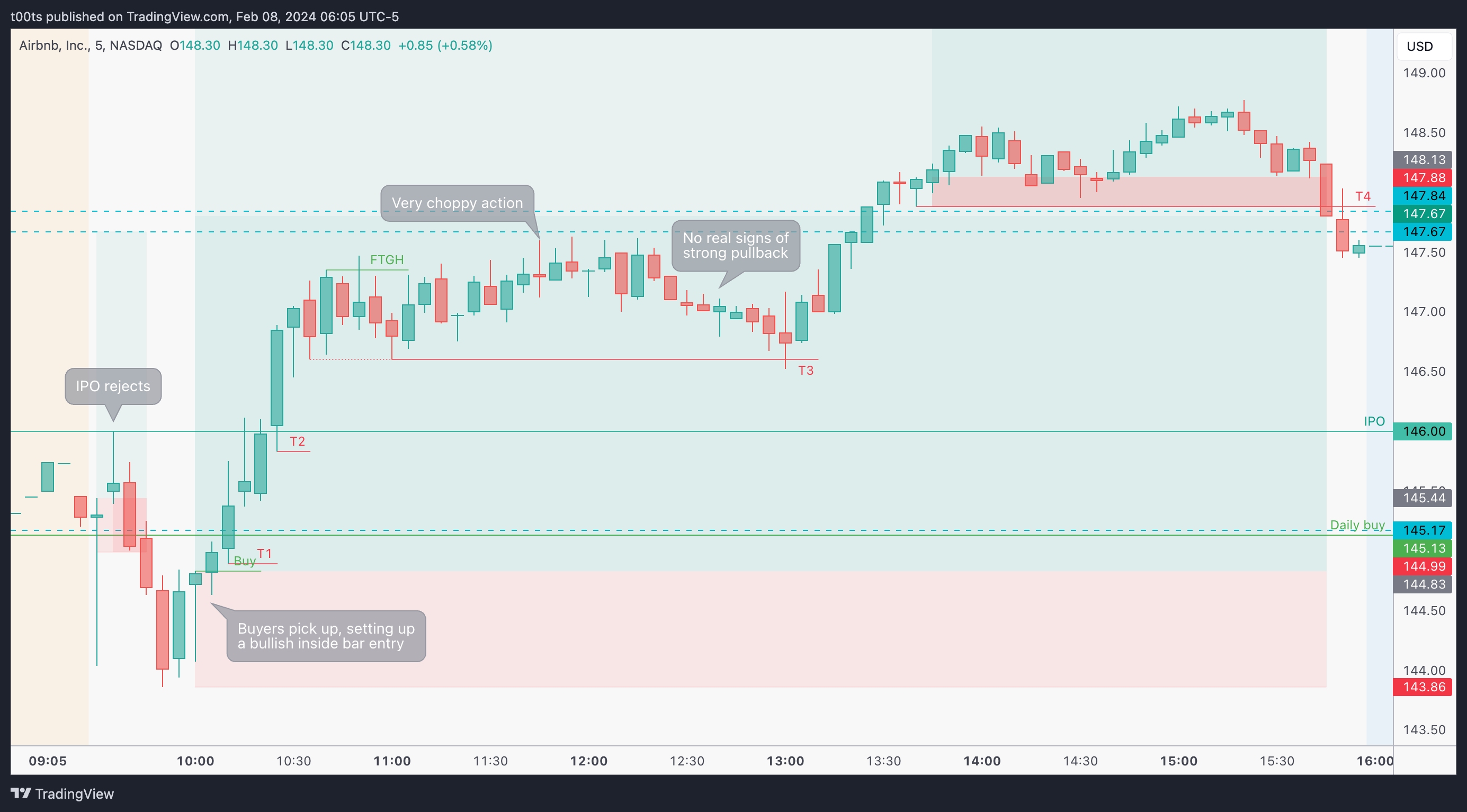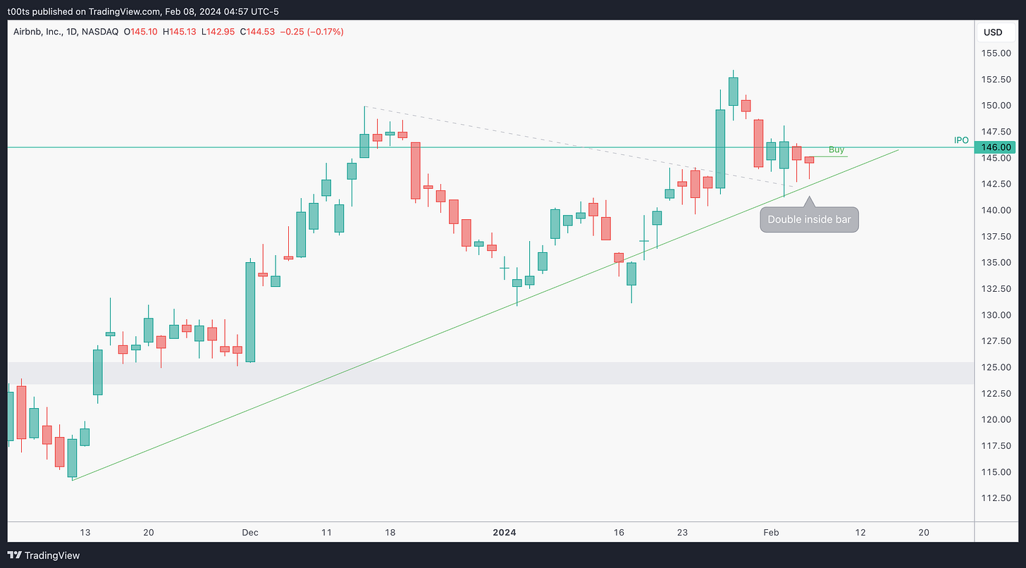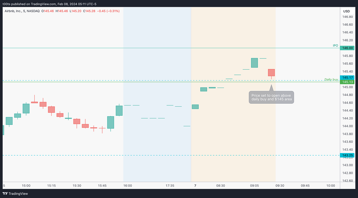 We recently went over a long trade on Airbnb. Yesterday it stood out to me again as it looked like it wanted to attempt yet another break of that IPO price mark that sellers keep defending. The daily chart was once again looking ready for a potential move up, and I took advantage of the opportunity. Let’s go over it!