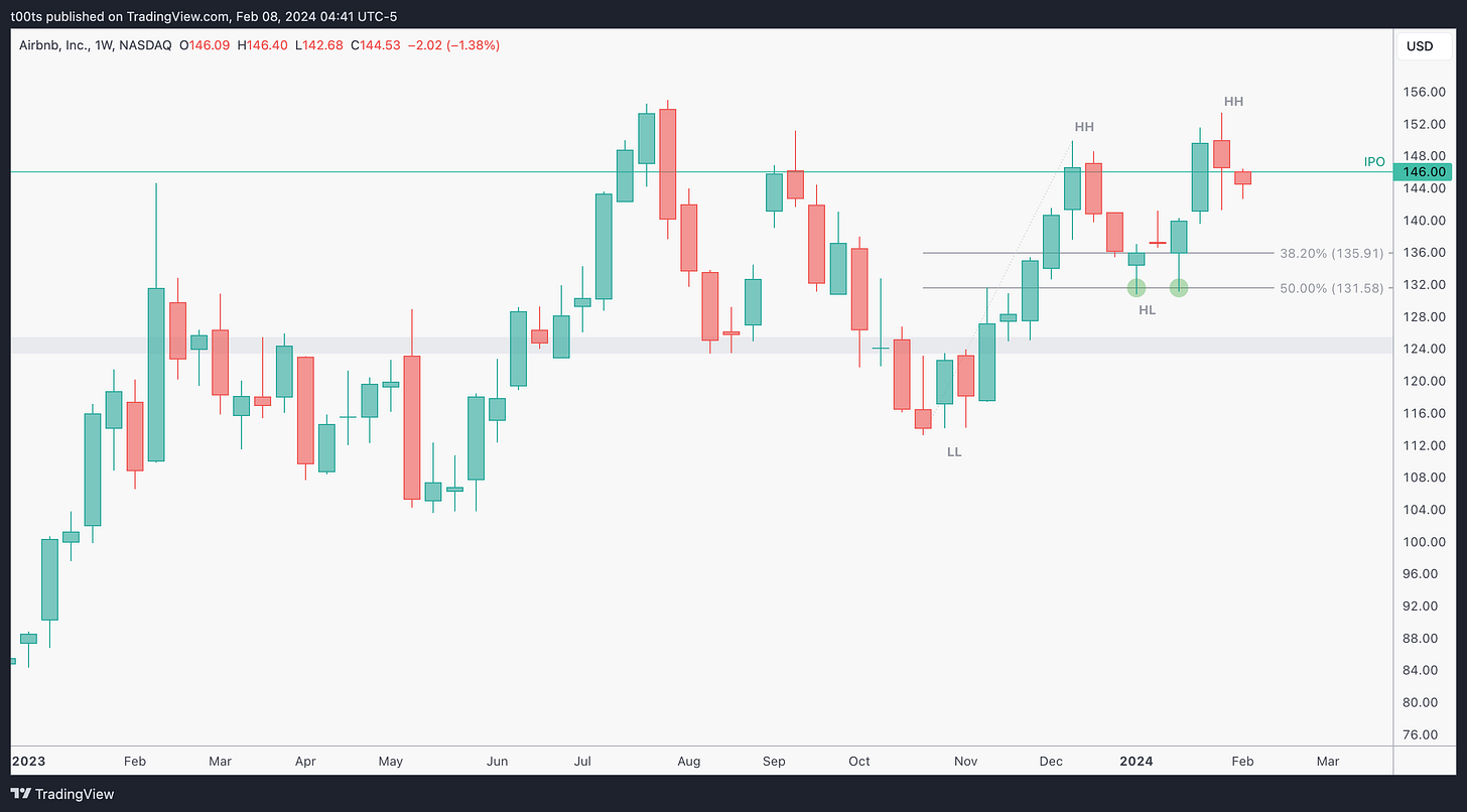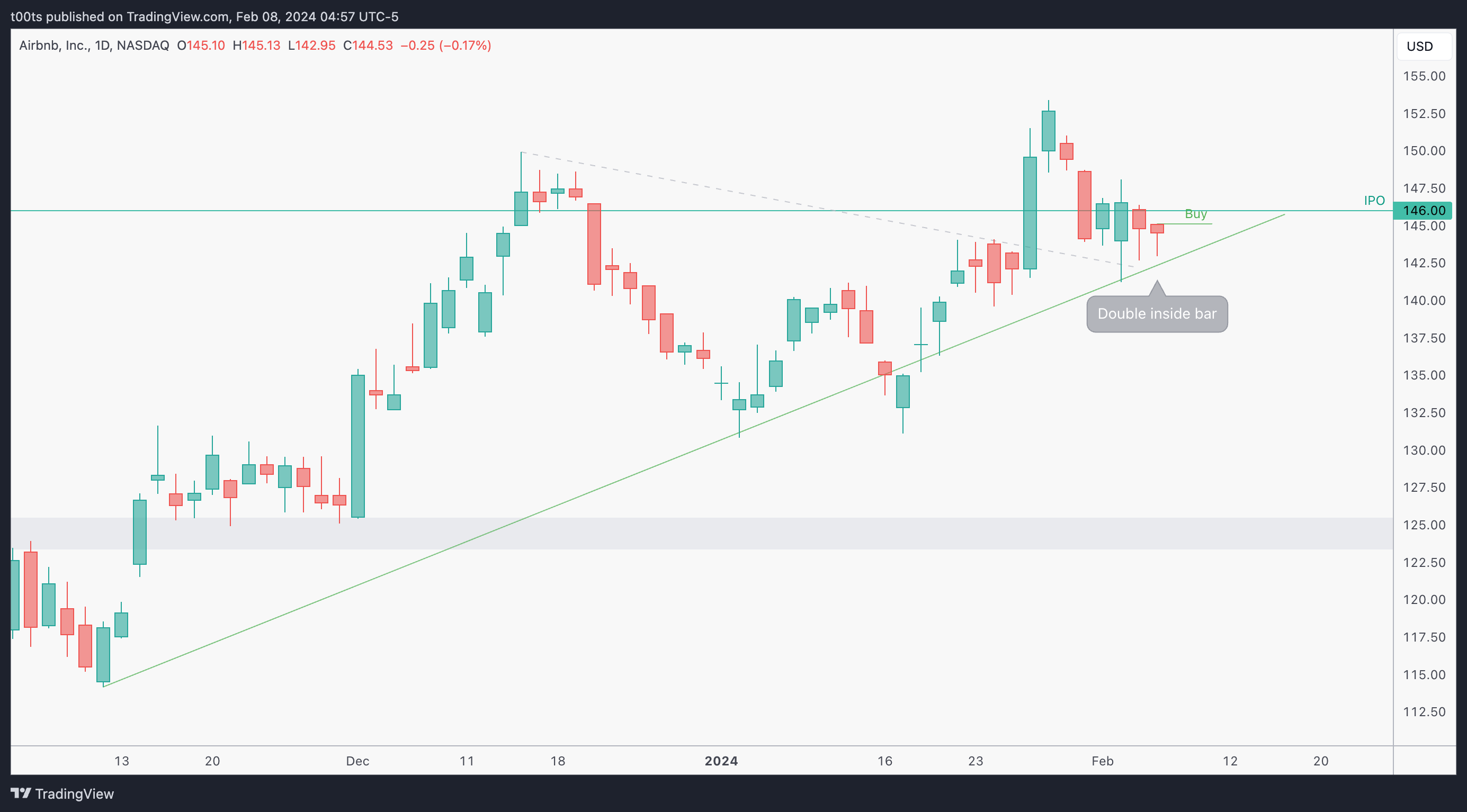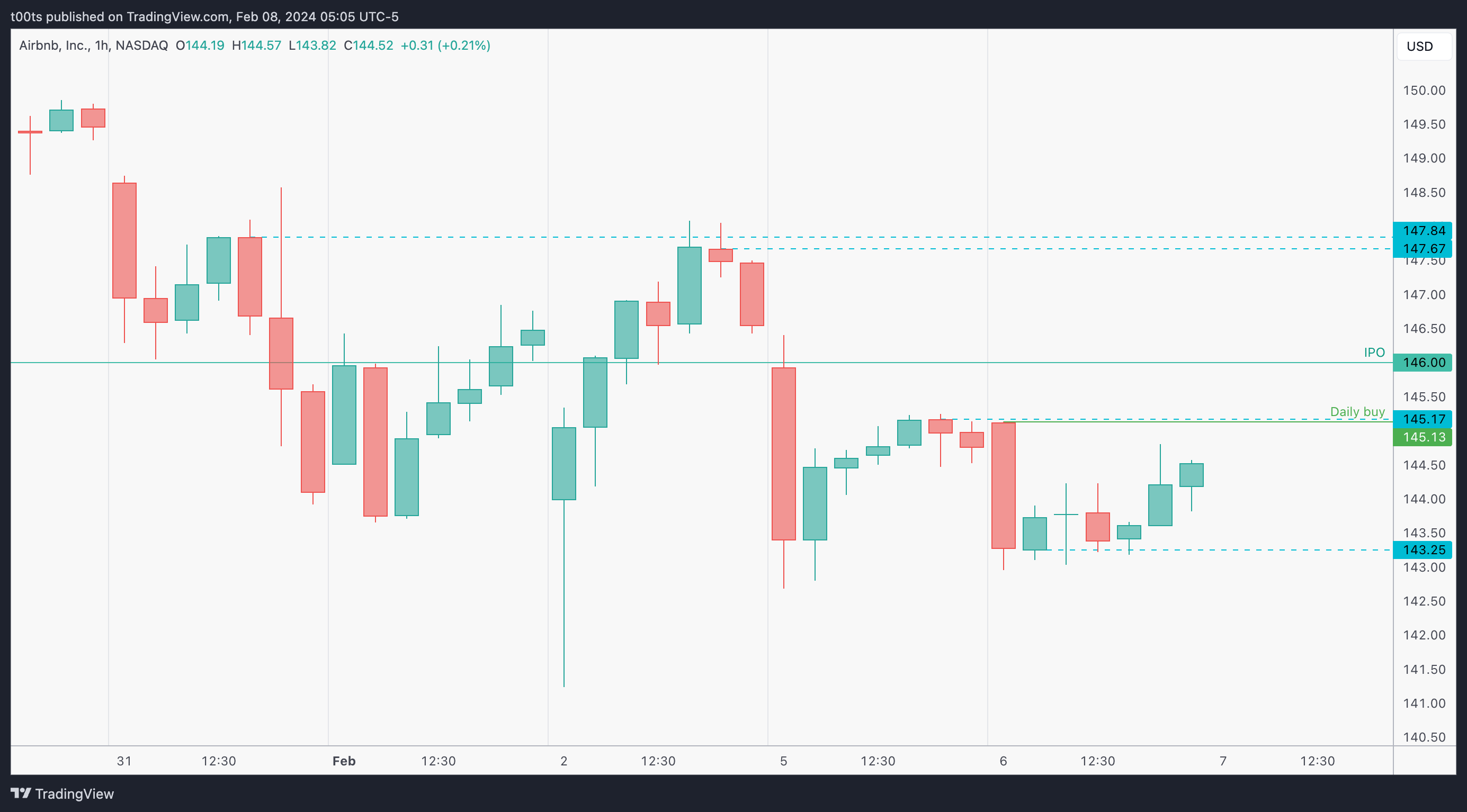 I like how the daily bar closed above the critical IPO price. We'll see what the rest of the week brings. Airbnb has its earnings release next Tuesday. Depending on the price action that leads us into the announcement, I will consider holding it through.