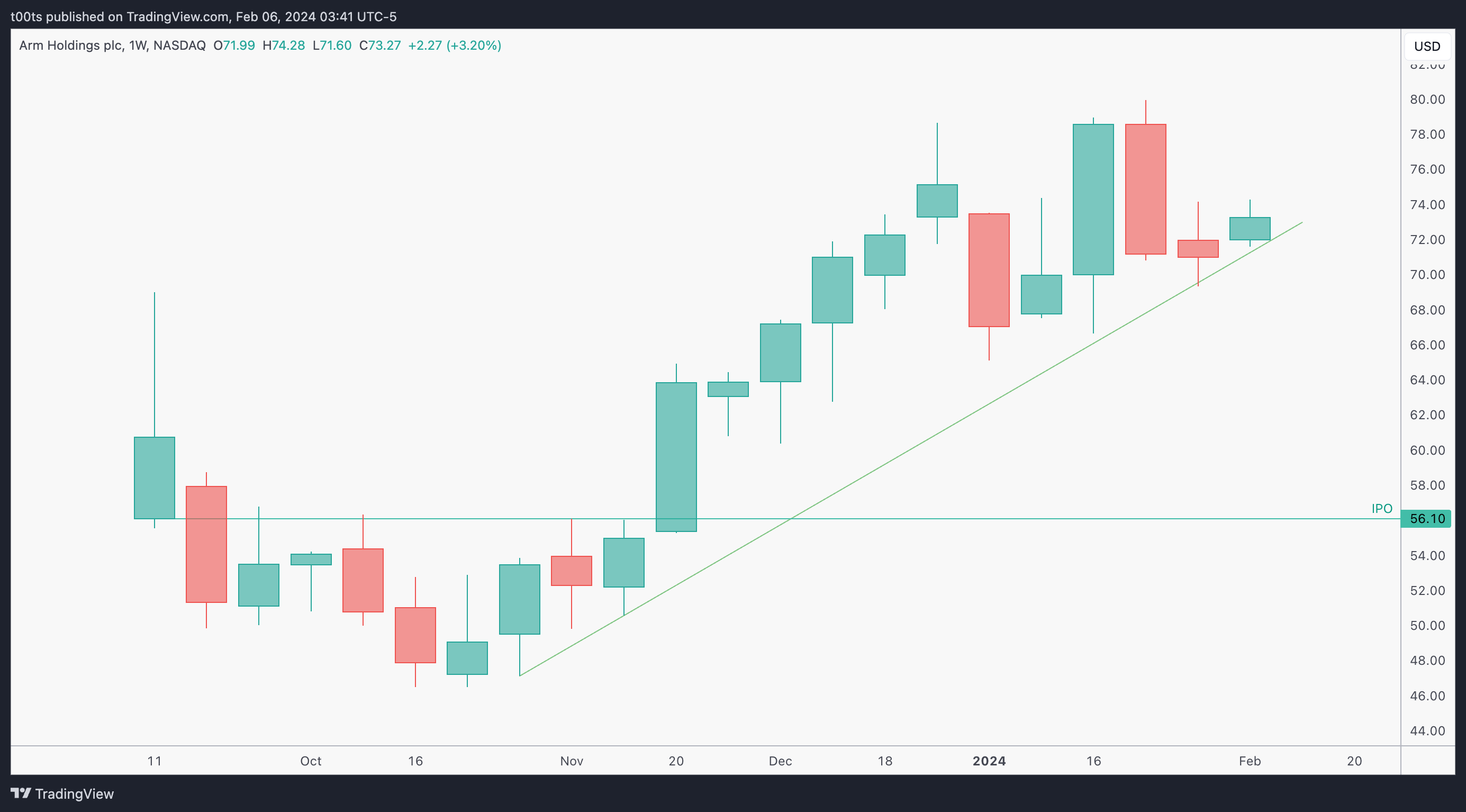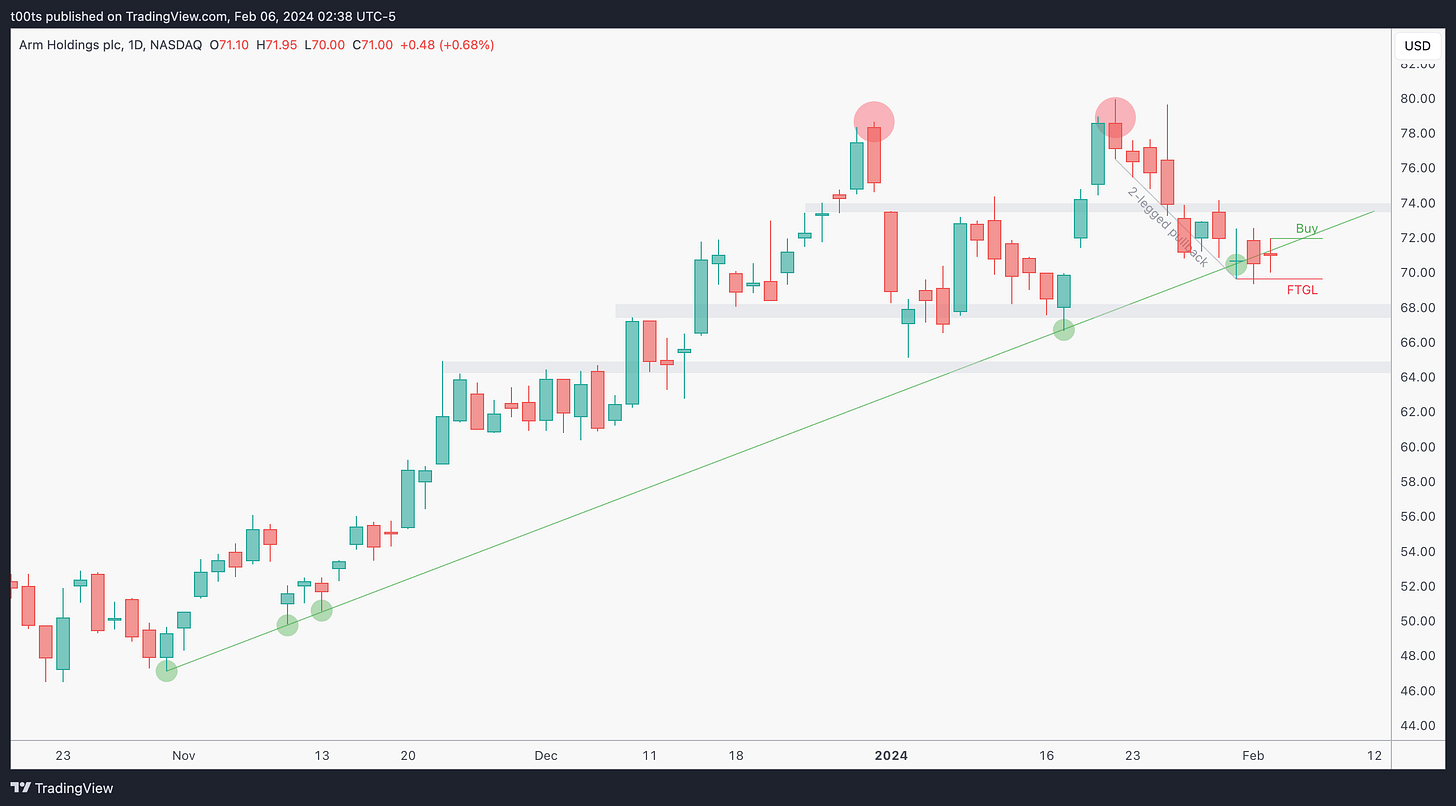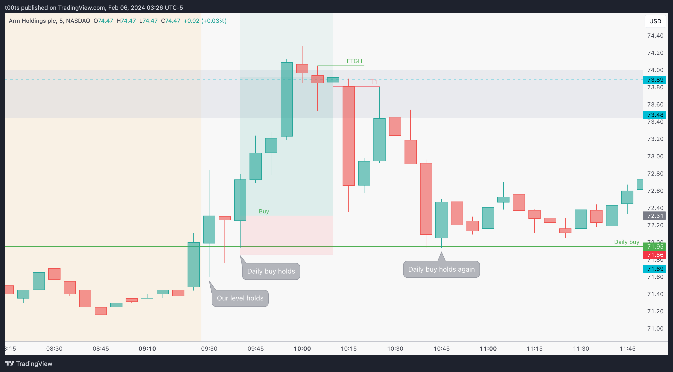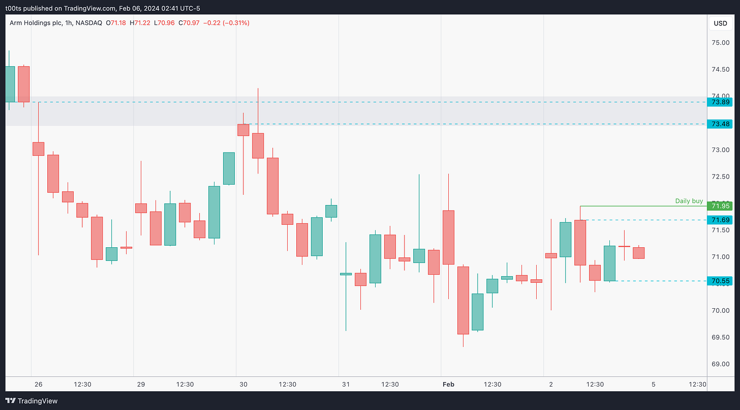 I held the trade longer because I wasn't actively monitoring it. But eventually, despite ARM's relative strength, I saw the market pulling back strong and decided to let go on that second rejection at the $73.48.