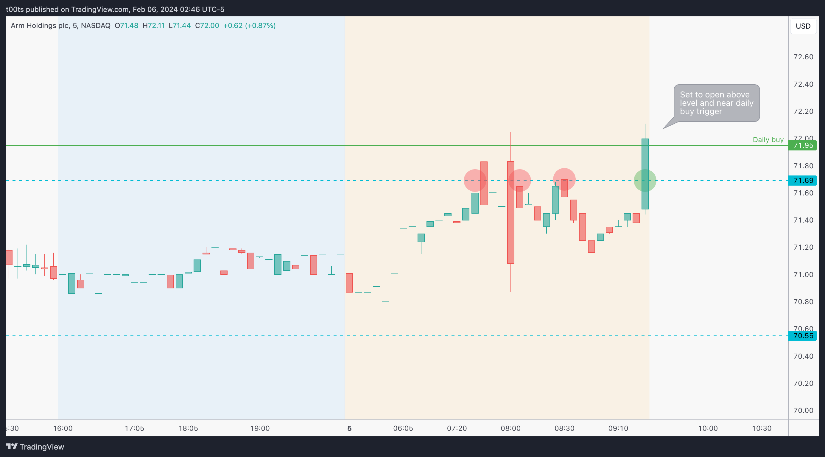The moment price keeps holding above our level, I honestly just got in. Went with shares so the risk was very limited. To keep things consistent and systematic, I've placed the entry on the break of the 5m 3-bar play, although I was already in it by then, with my stop set around the $71.50s (low of day), and not even looking.