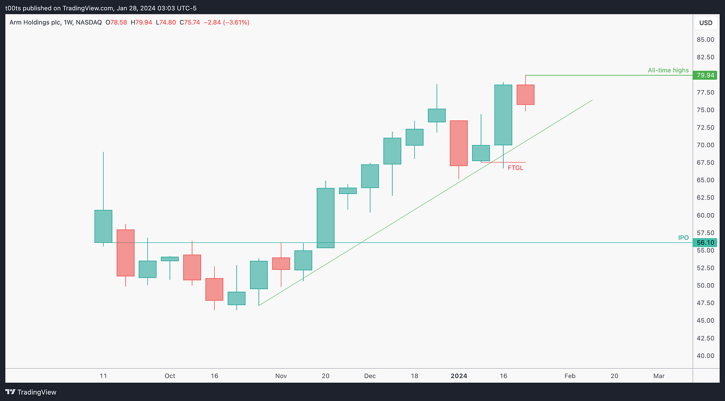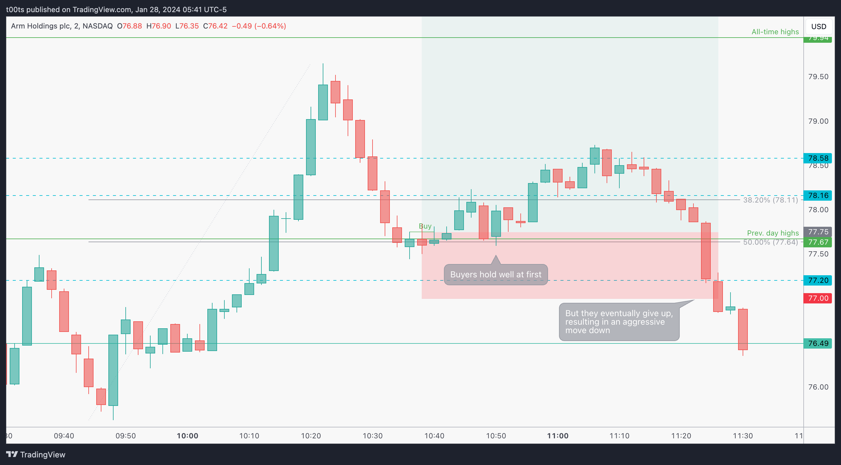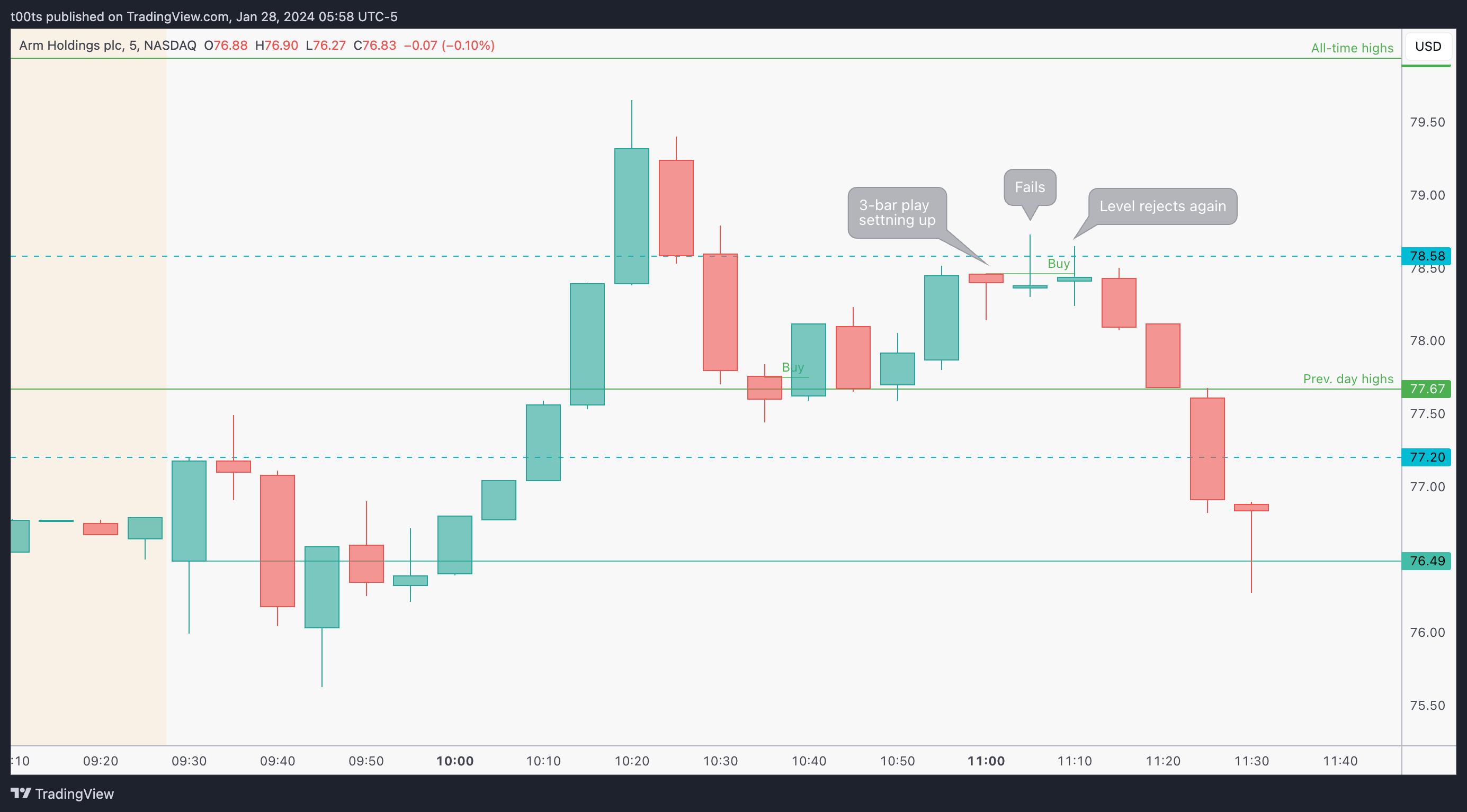 At a certain point in the day, I saw that ARM was the strongest stock in my watchlist. At the same time, I was giving up on my attempt to catch a sub-200 TSLA long with shares.