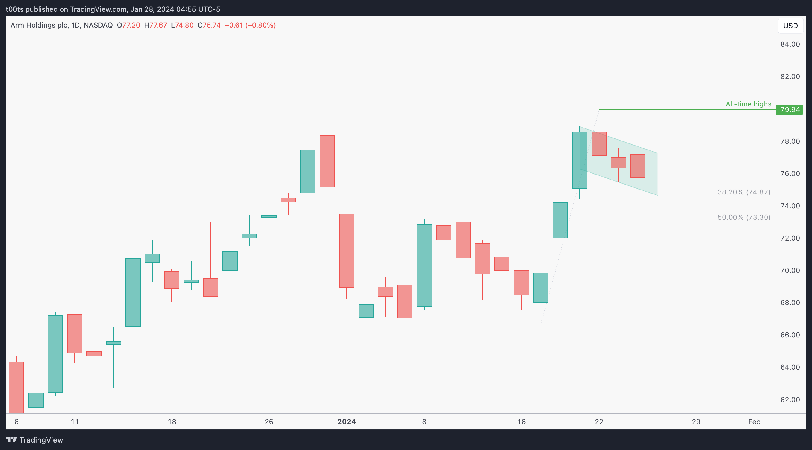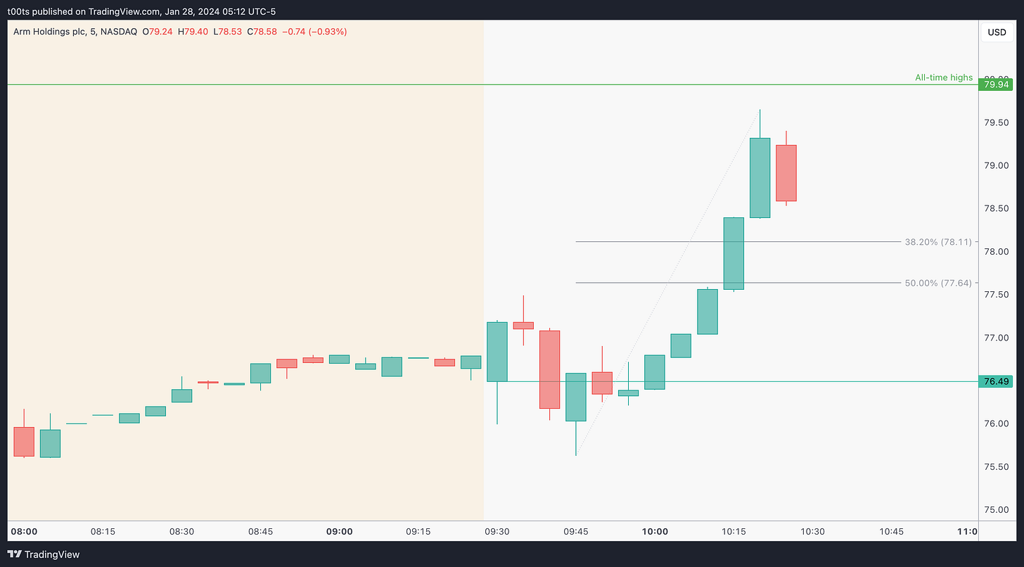 Around 10am, ARM started taking off. This is a stock I've been watching a lot lately, but on this day TSLA had just reported its much awaited Q4 earnings, so many eyes were on her, including mine.