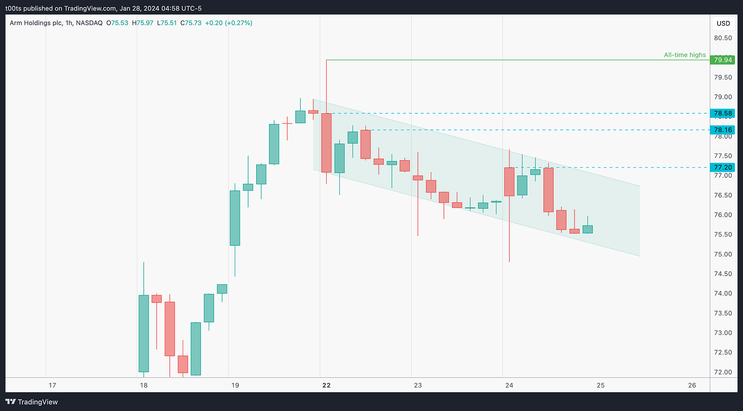 As usual, we get a few levels of reference from our hourly chart. We can also appreciate in greater detail the price channel that's forming the flag. Price trading above the $77.20 level should get things interesting to consider longs.
