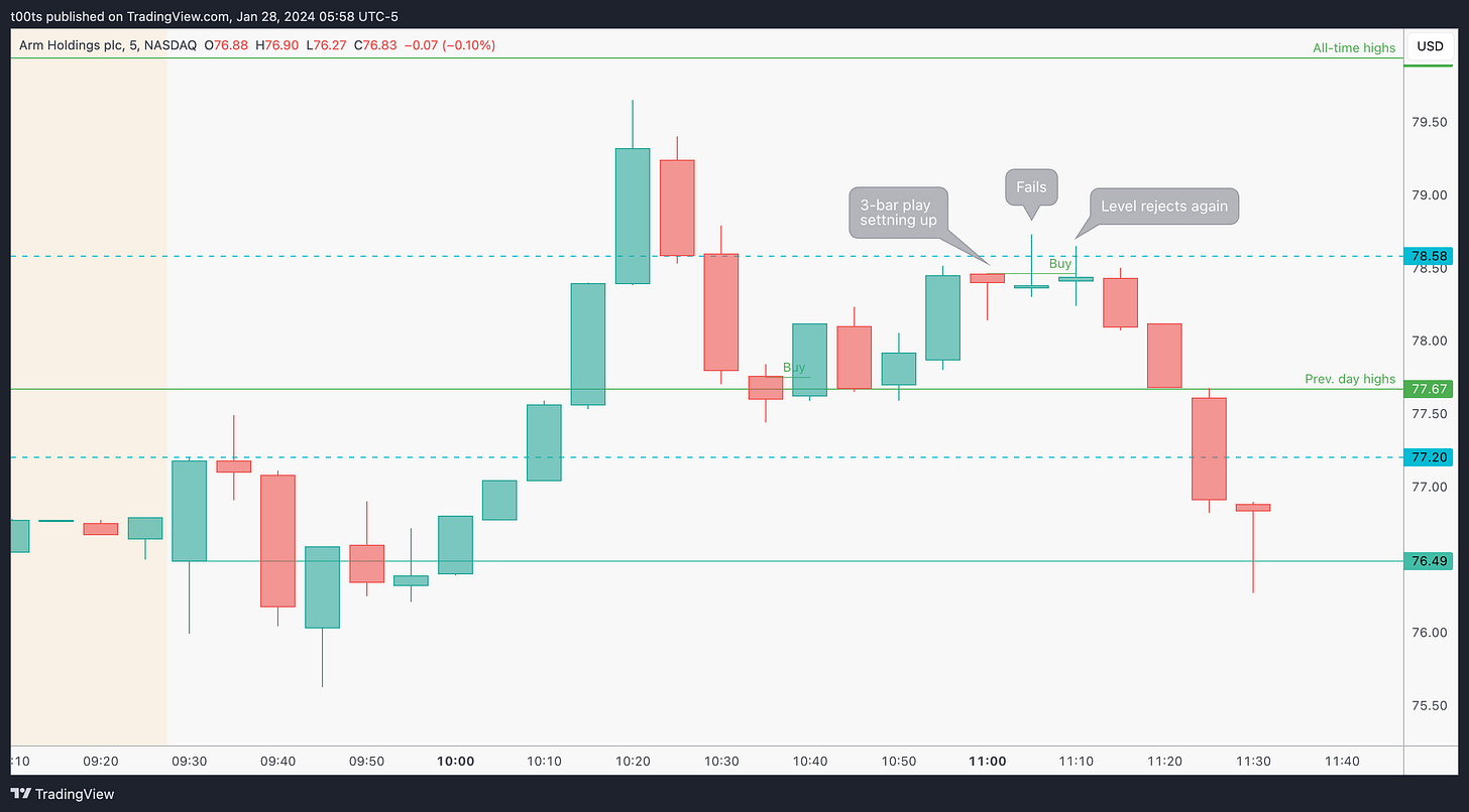 Here's a 5m chart so we can zoom out and get a little bit of context. I rarely trade off a 2m chart past 10am. Again, there was some FOMO involved in this trade. Anyways, check how that beautifully set up 3-bar play failed. Right after that failure, the level where it failed at rejects again. That's two failures at a level, which as we know often lead to good counter-trend moves. Big warning sign there for longs, which I obviously missed.