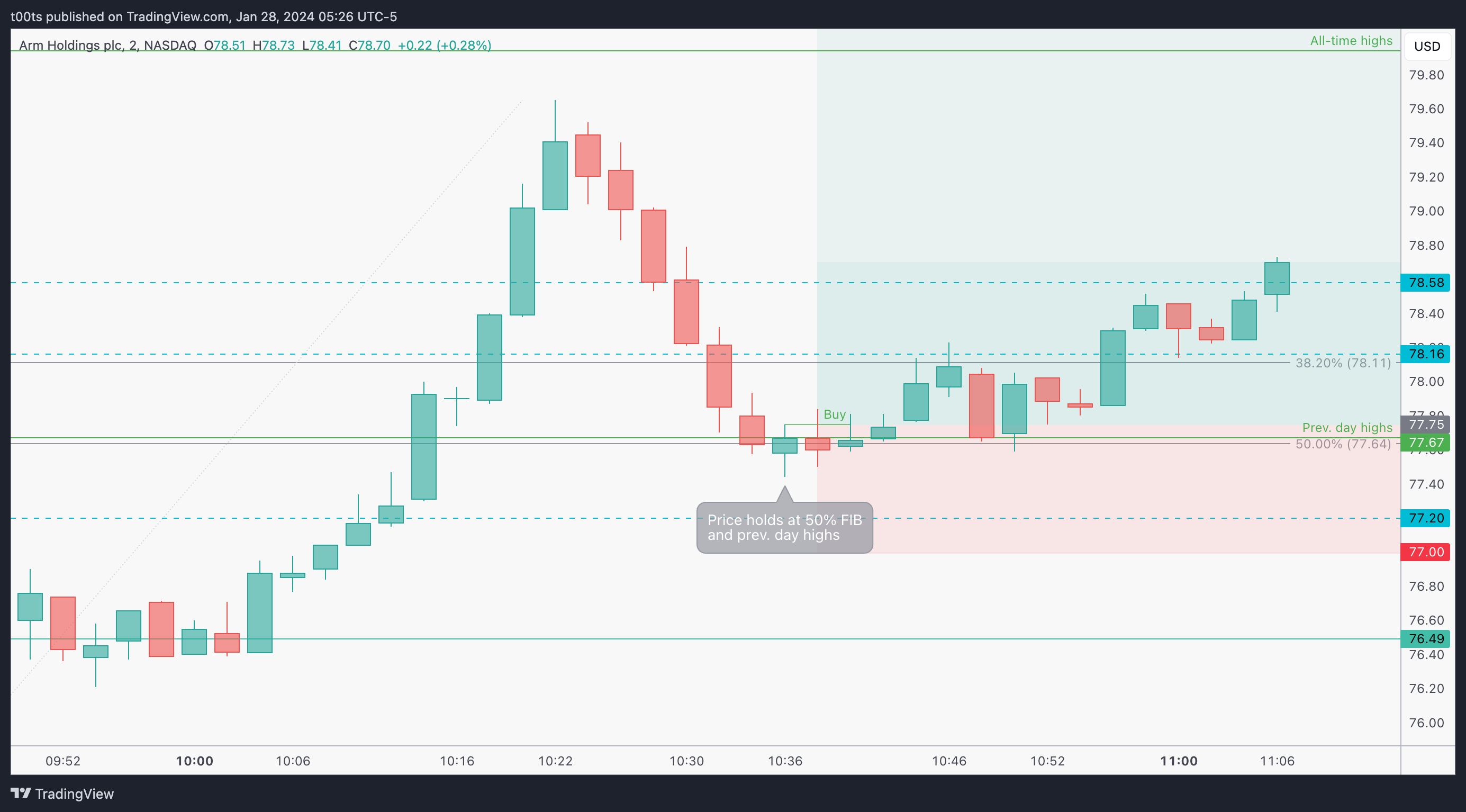 On the 50% retracement area, price seems to hold. It aligns almost exactly with the previous day highs. I get involved using the 2m buy setup, arguably rushing into the trade. Here’s my entry: