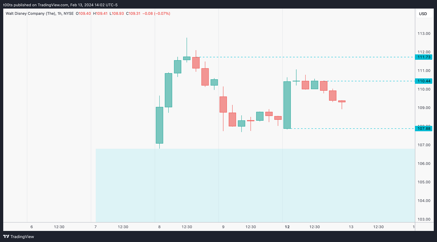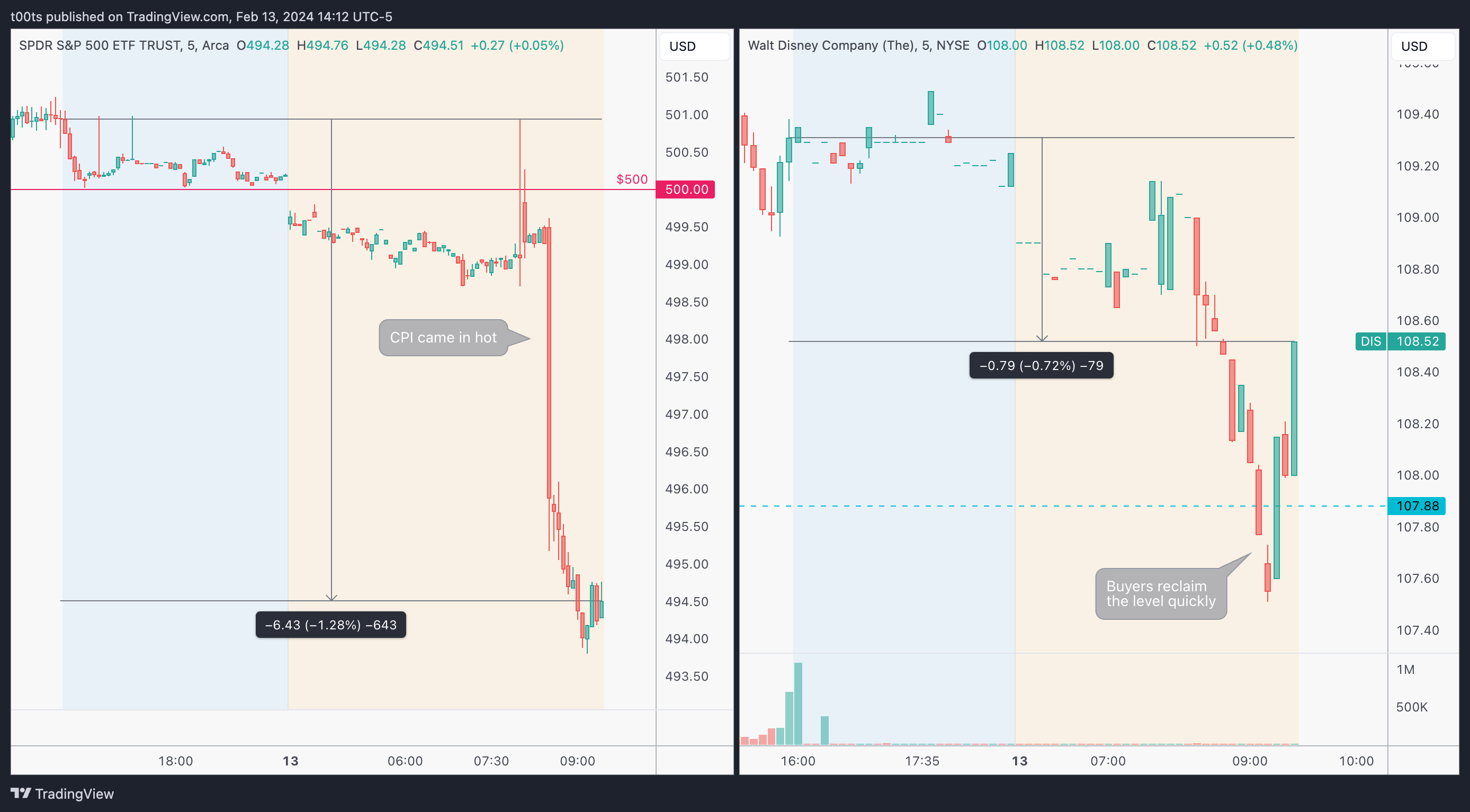 Here's where things start getting interesting. It's CPI day and the report came in hot. Inflation came out higher than expected and the market sold off as you can see in the SPY chart (left). However, while the SPY and many other high beta stocks are set to open considerably lower, Disney (right) stands out on how well it held the drop.