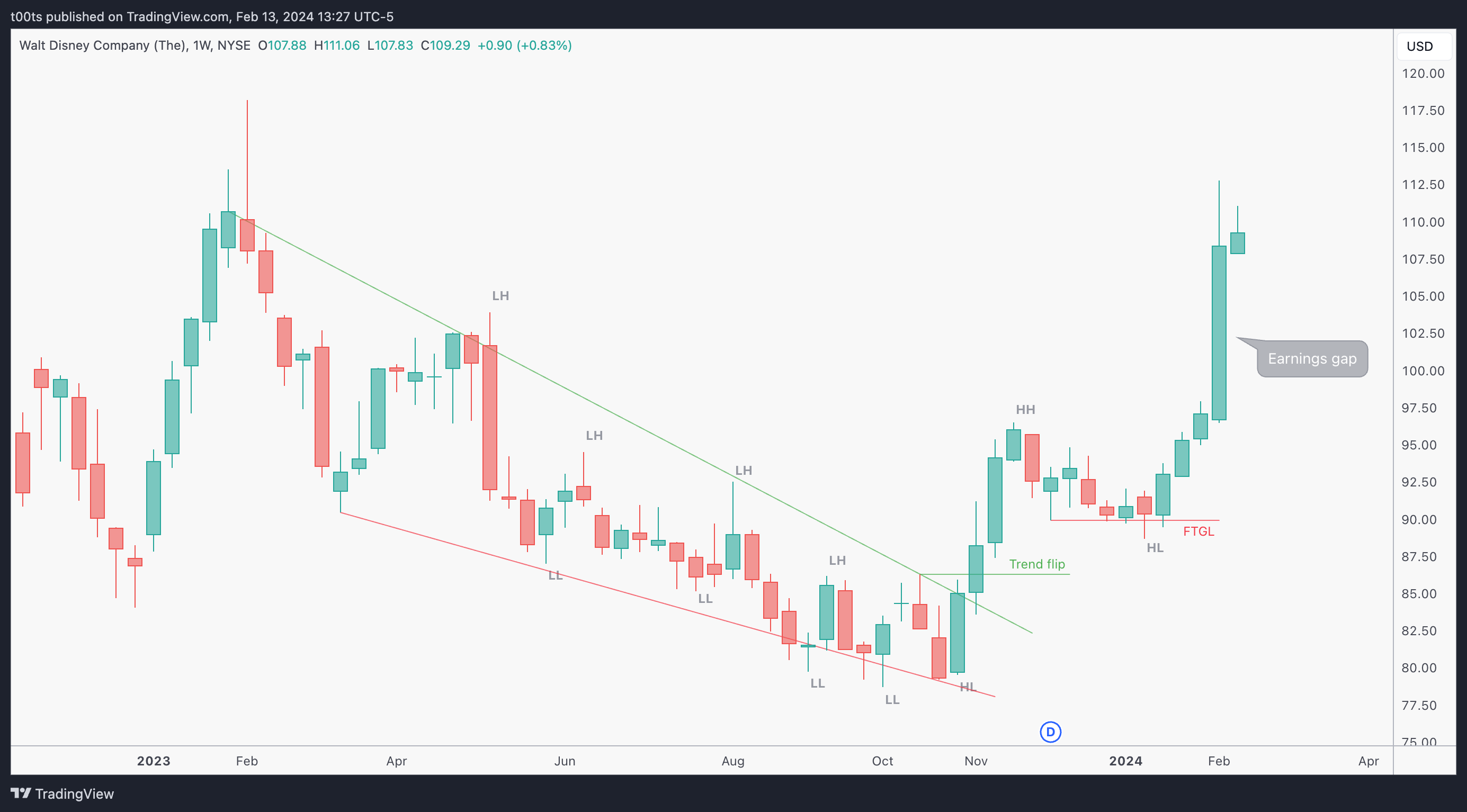 Price broke the long multi-month descending wedge, flagged nicely for 7 weeks, even giving us a few failures to the downside, and resumed the uptrend. The previous week monster candle is due to an earnings gap we'll be able to appreciate on the daily chart.