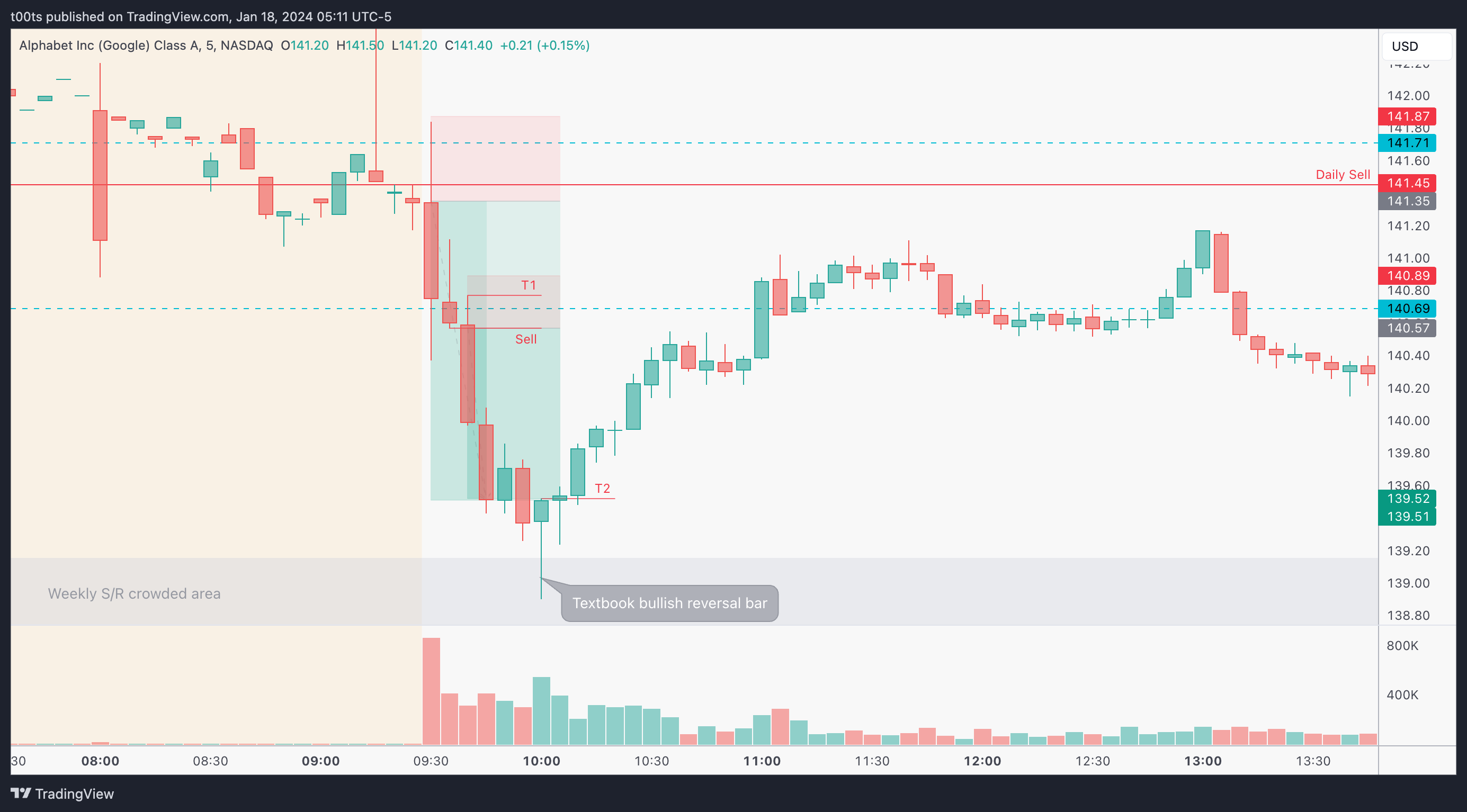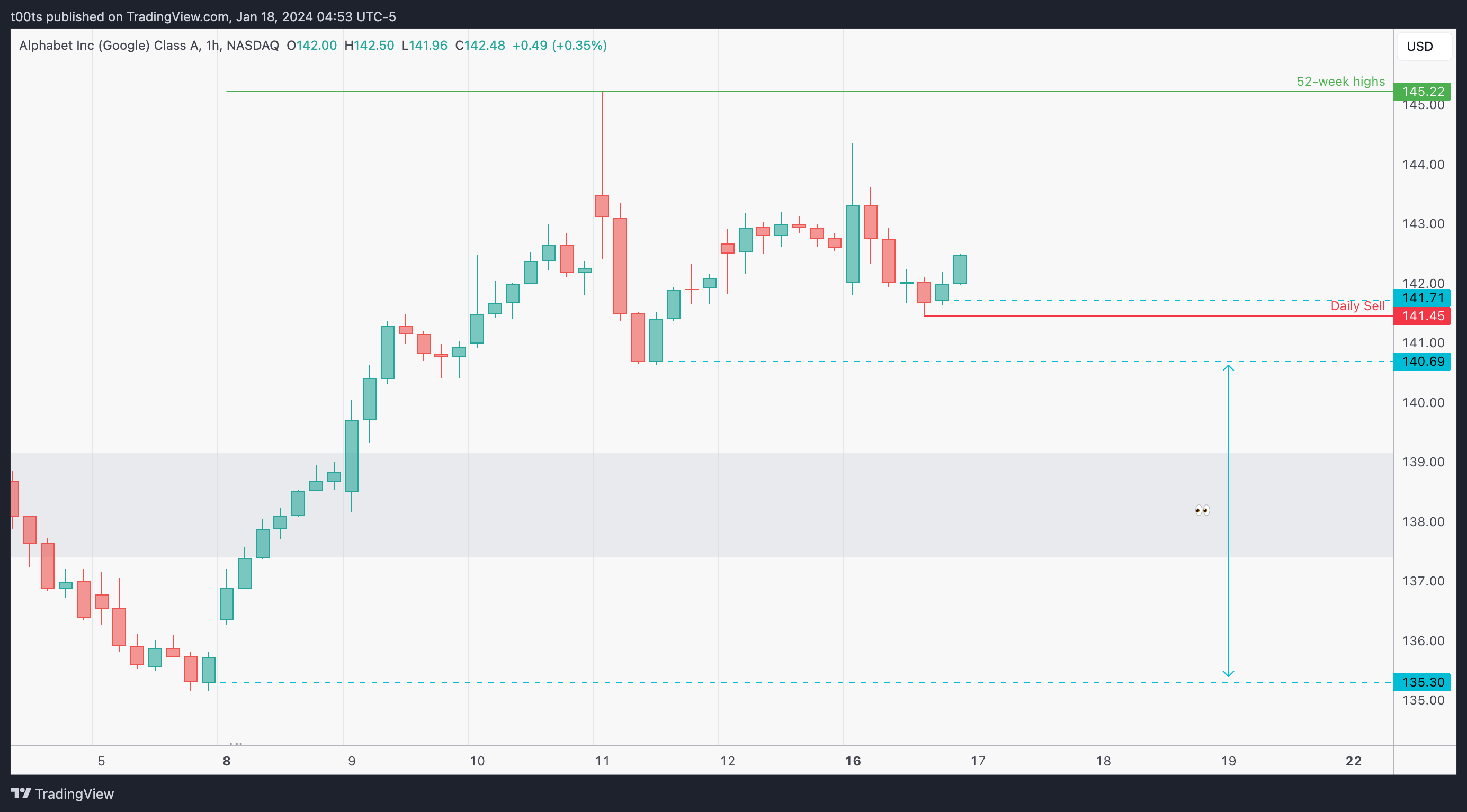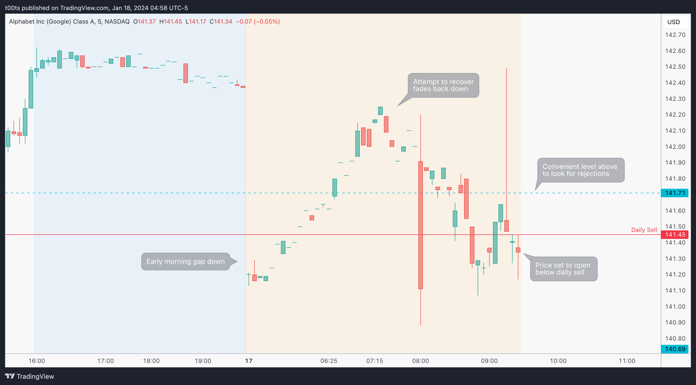 We want to see a test and strong rejection of $141.71 level. That's our first intraday cue that we're looking for. If we get that and price comes back down below the daily sell, we can effectively use the opening print as our entry level, risking against the highs or even a few cents above the daily sell.