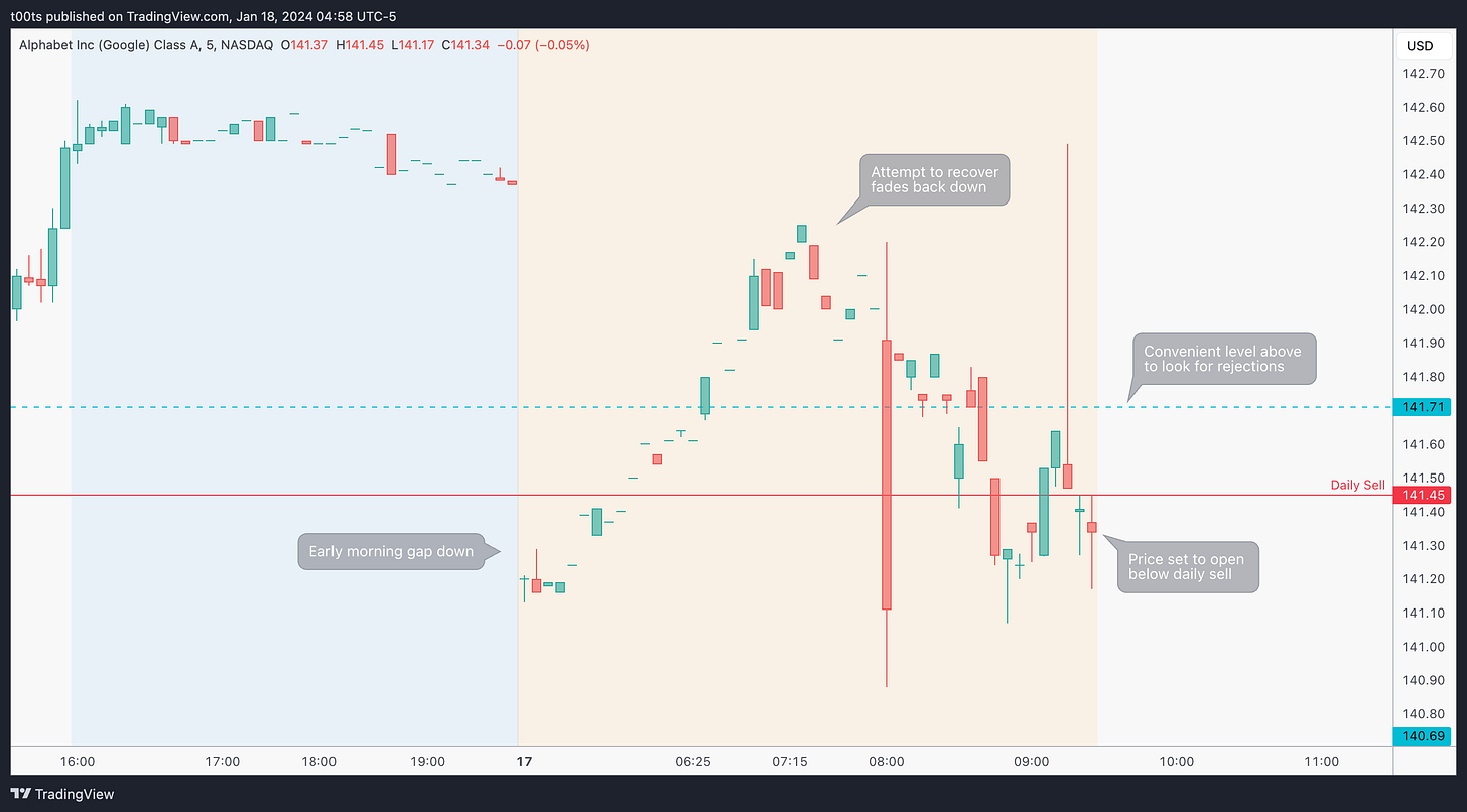 As previously mentioned, we have a level right above that we can use to trade off of. We also have our daily sell level, and we'll have our opening print right under this sell trigger. The avid reader can probably already devise the plan.