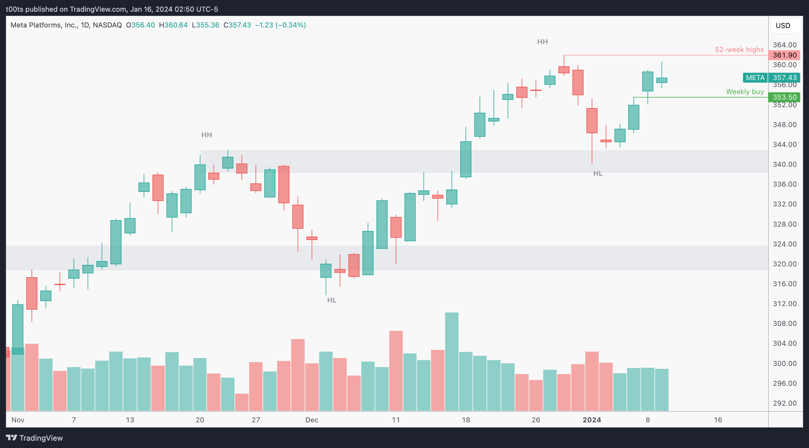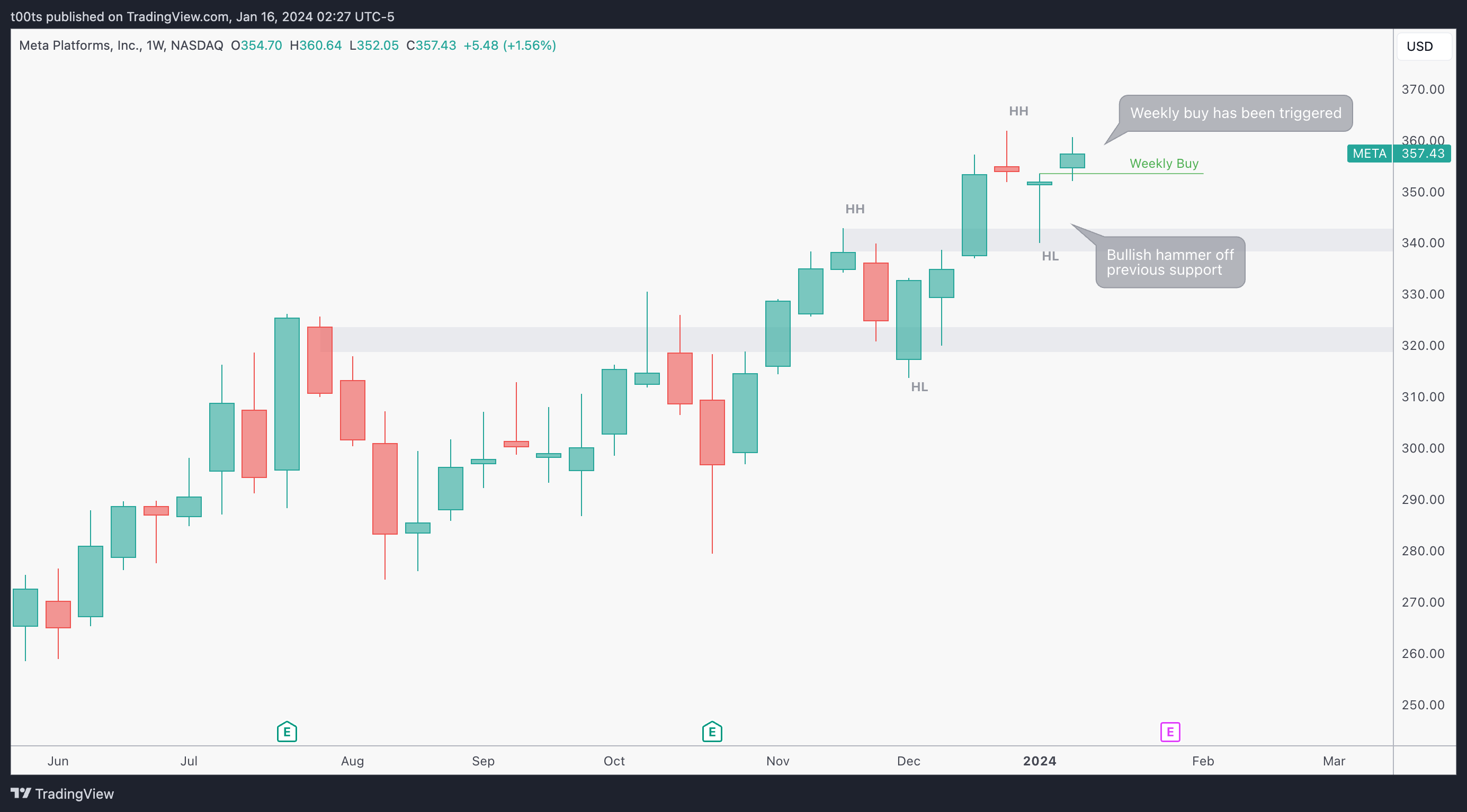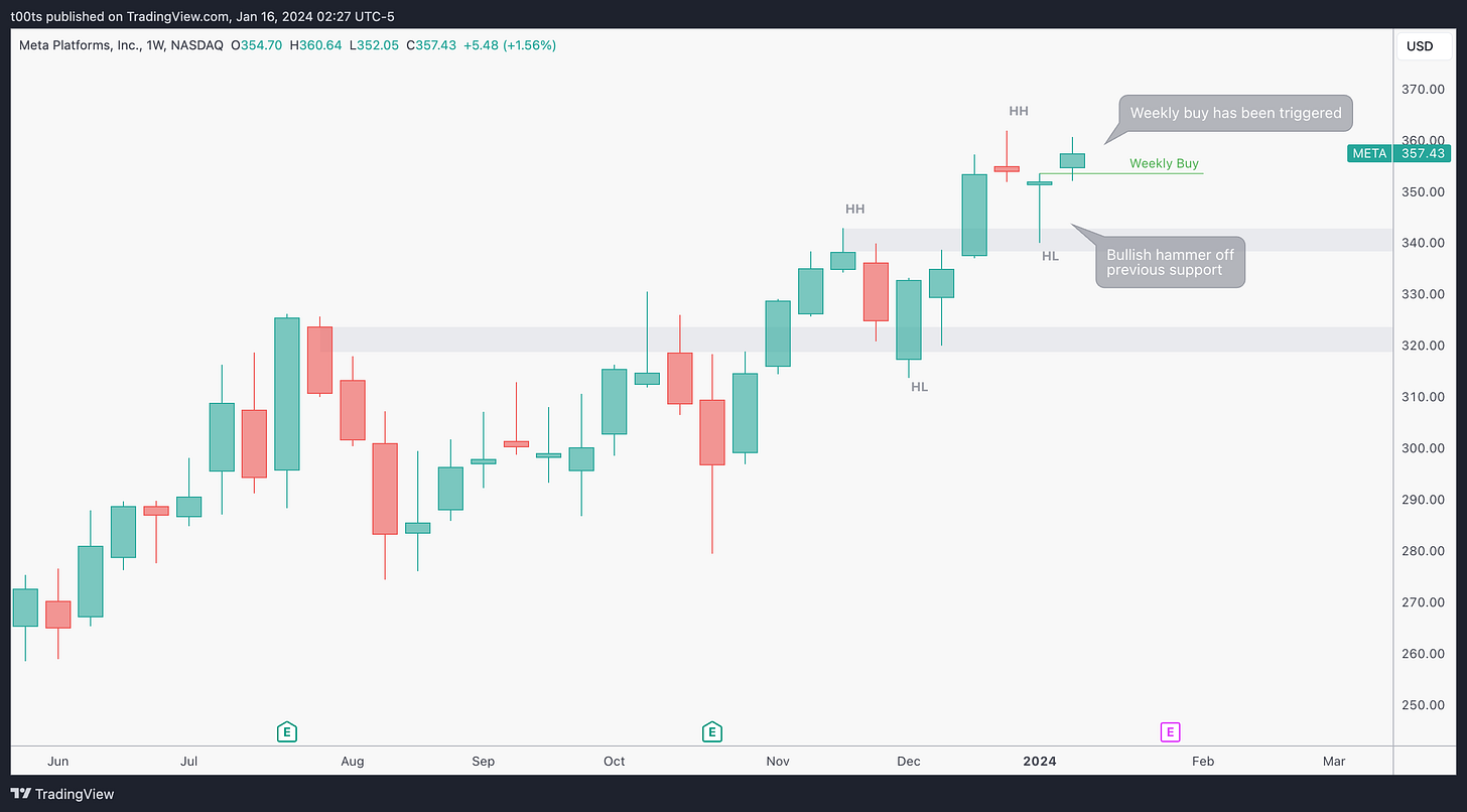 META is very close to its 52 week highs. The uptrend is unquestionable on this name and there's no signs of stopping. We can clearly see higher lows and higher highs being put in, and more recently a very appealing bullish hammer bar bouncing off the retest of a previous breakout level. The classic breakout and retest that every trader learns in their first few days of price action basics. Well, there it is.