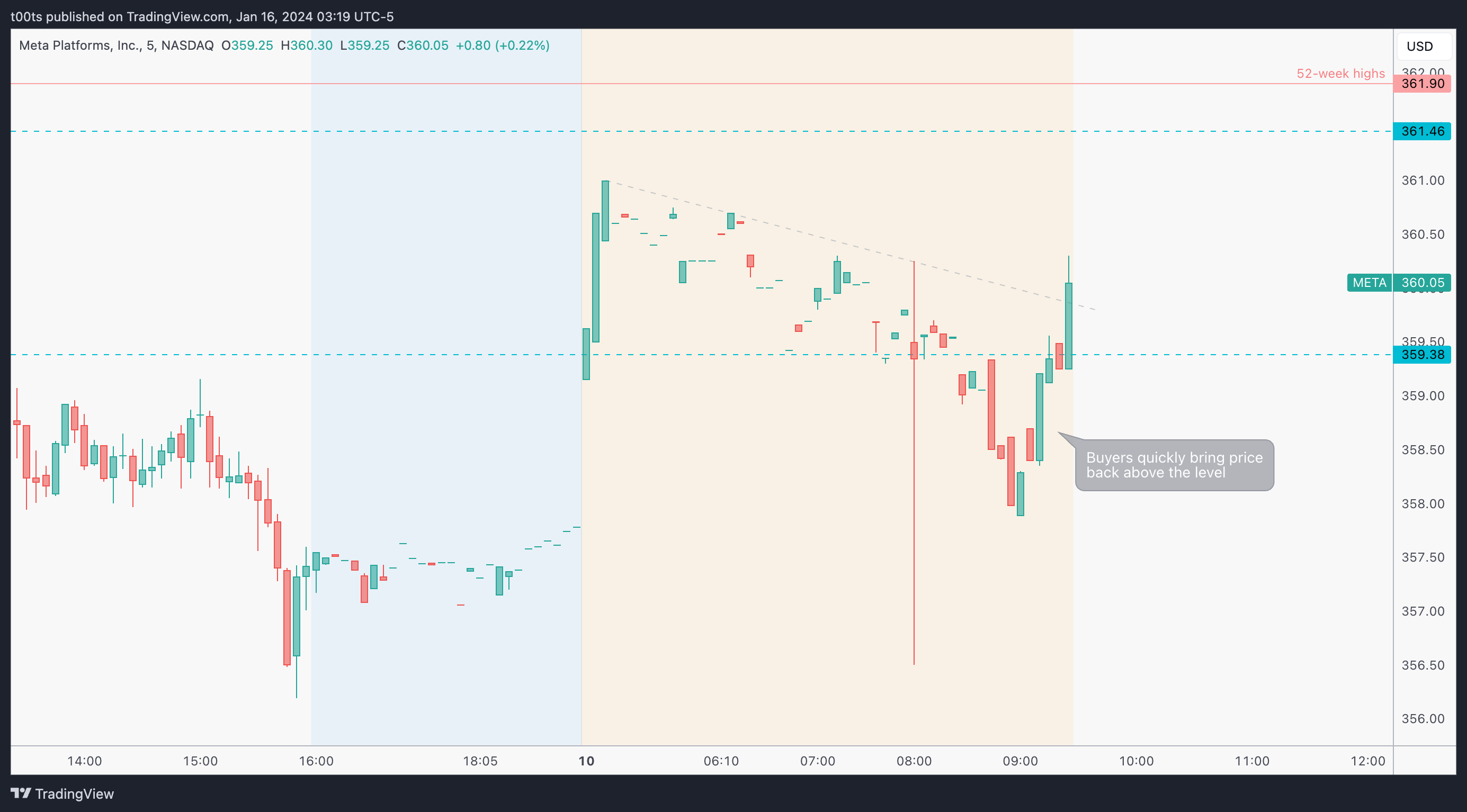 Honestly, there's not much to go over on this pre-market chart. Stock is set to open with a slight gap up but nothing notable. The only thing that's worth commenting on is how quickly buyers rushed to bring price back up the moment it lost that $359.38 level from yesterday. While that is certainly a good sign and denotes buyers are still very interesting in bidding this name up, it doesn't really give us any actionable insights in my opinion.