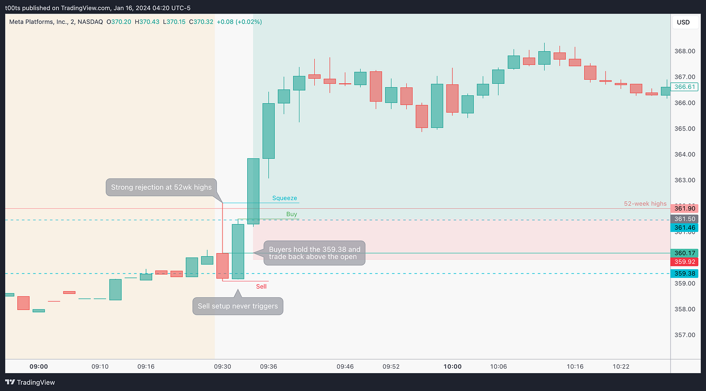 Scenario 1: In an ideal world, we'd like to participate in any buying opportunity off a bounce of the $359.38 level. However, we do have the $360 psych. level right around where we're set to open. So might as well wait for a dip and buy the $360 reclaim if it ever happens. If the stock rejects the $360 there's no trade unless price gets back above it.