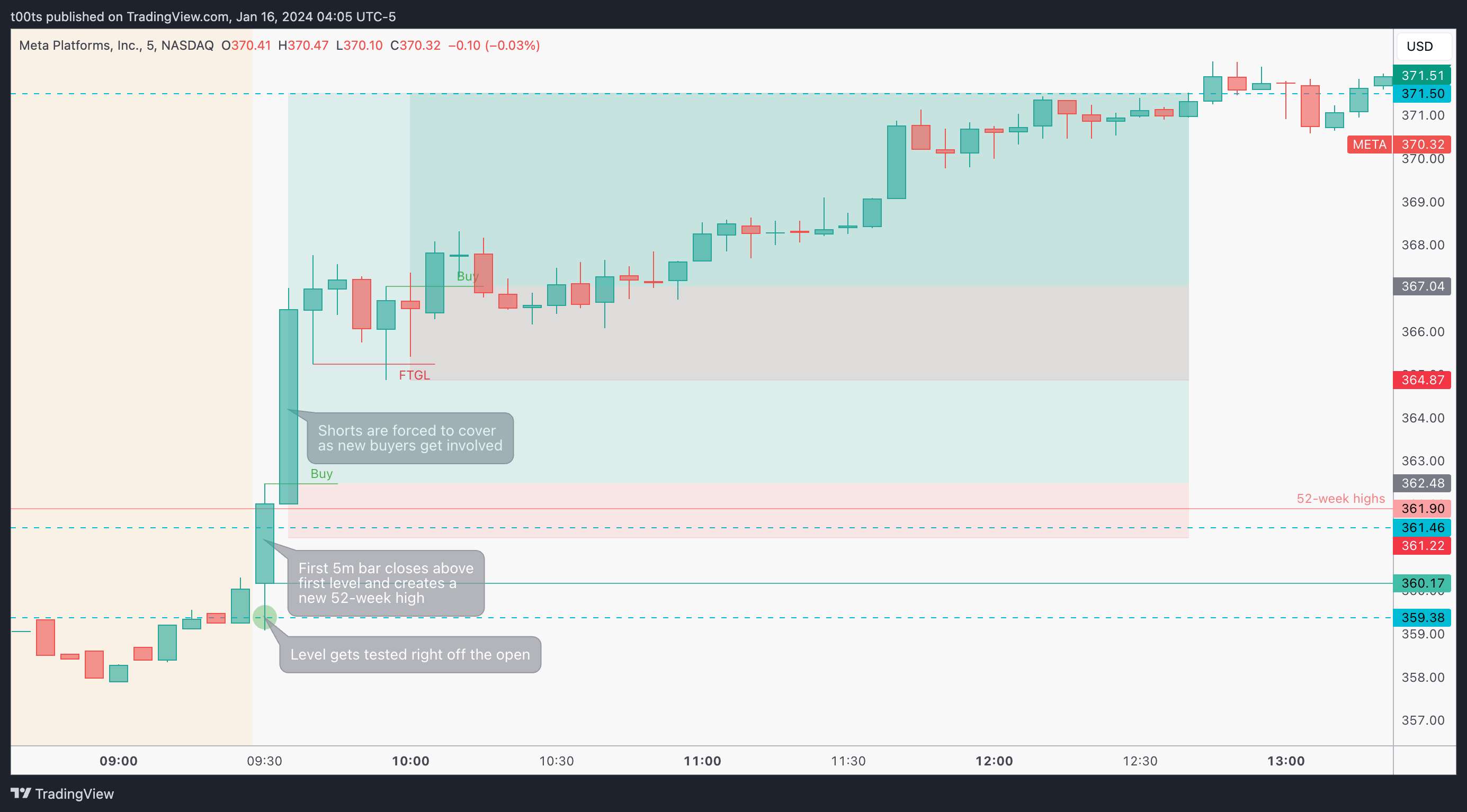 The moment price breaches those 52-week highs, short sellers are forced to cover, pushing price even higher on strong momentum. You had no other choice here but to get involved and ride that momentum. If you waited for a pullback, you would've been a buyer on that second buy setup I outlined on a failure to go lower for a slow and frustrating +2R trade (but of course you don’t know at that time).