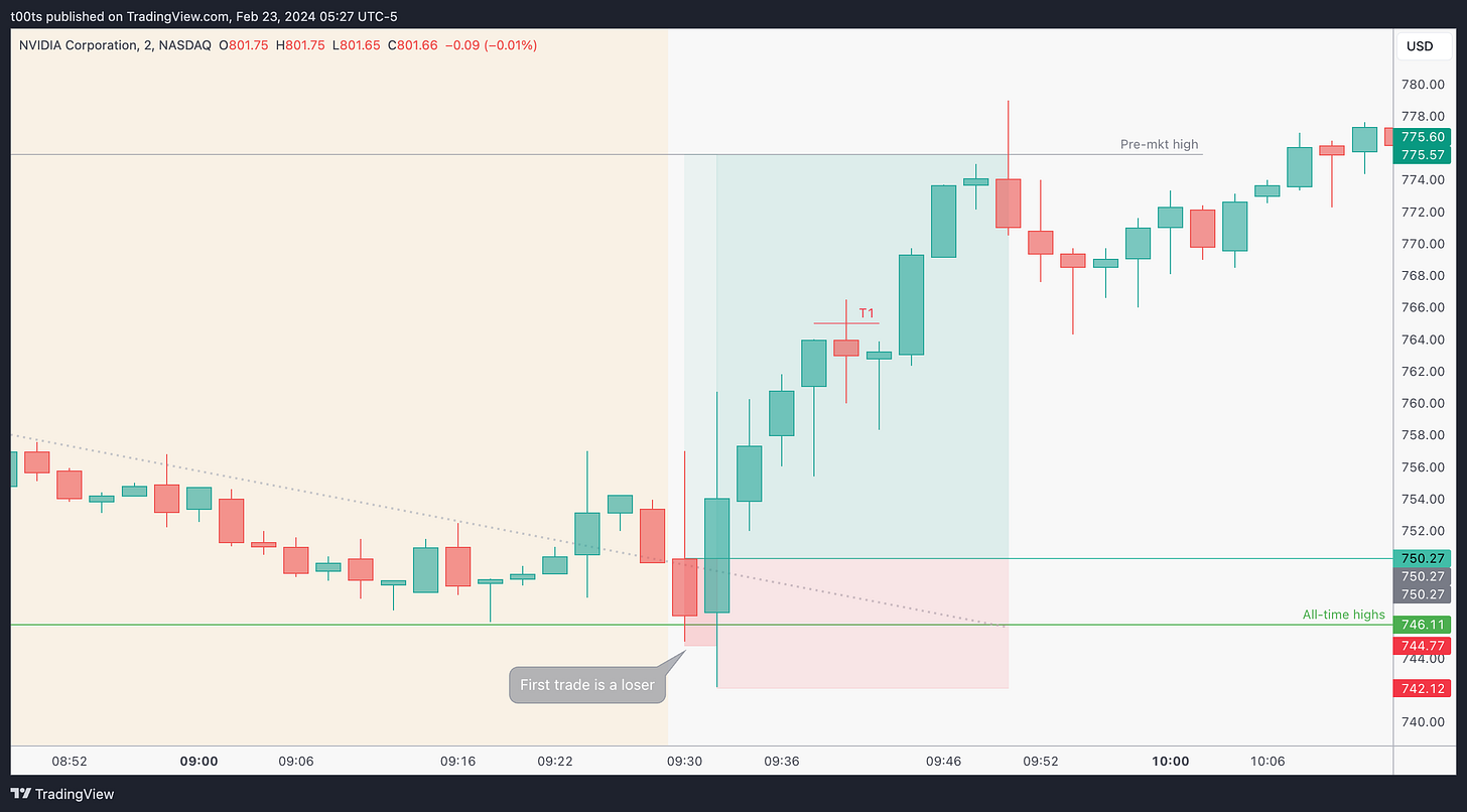 Whatever we do, we're risking the low of the day. We can't wait and hold to see if the $740s hold. We get out first, and then get back in if needed. Our target is the $765 level which acted as both support and resistance during the pre-market, and then the pre-market highs.