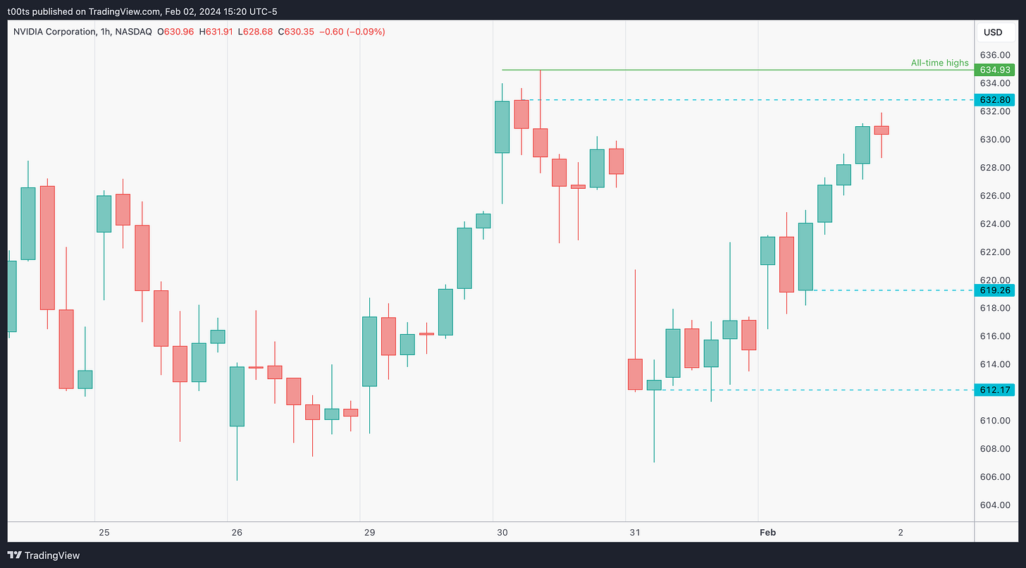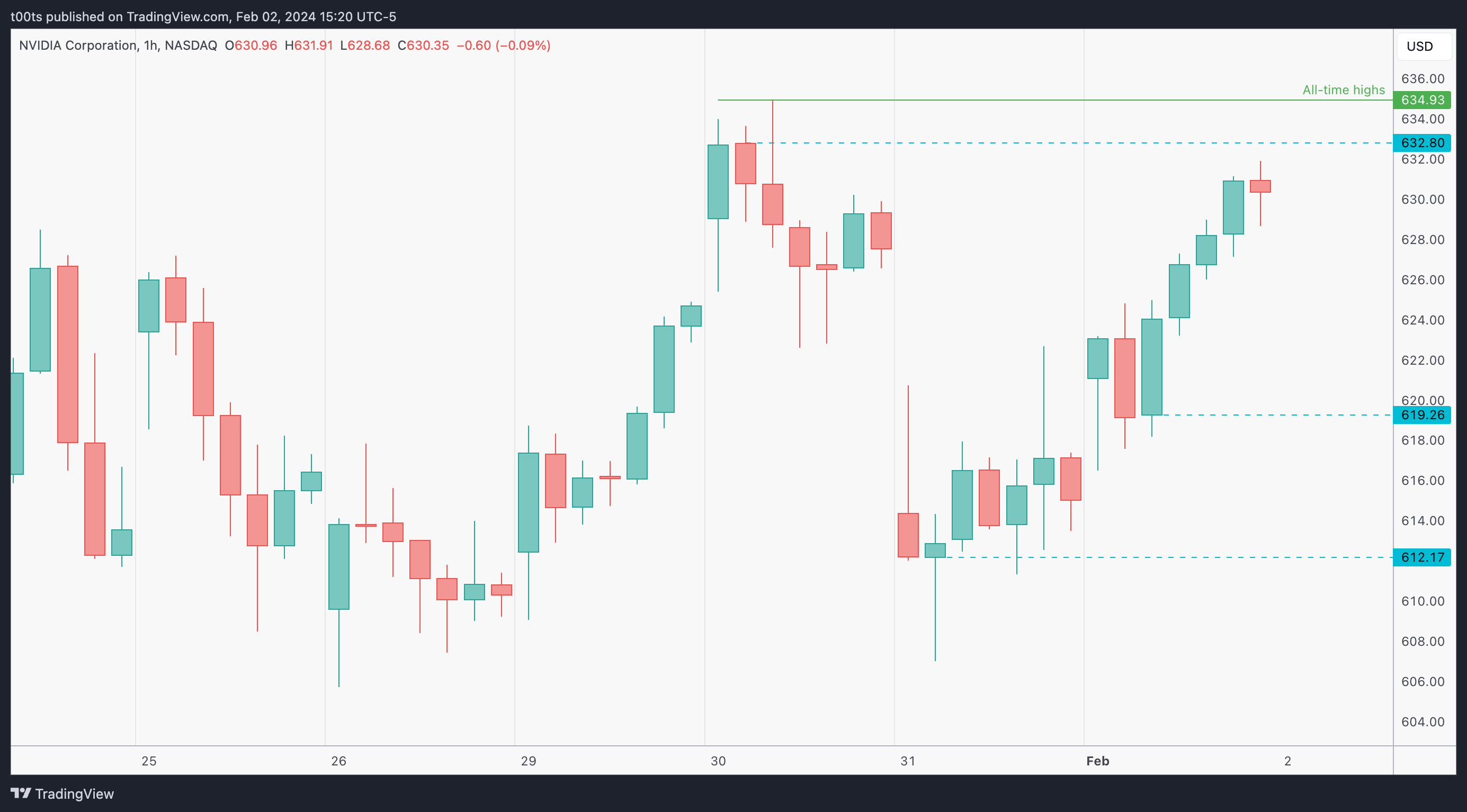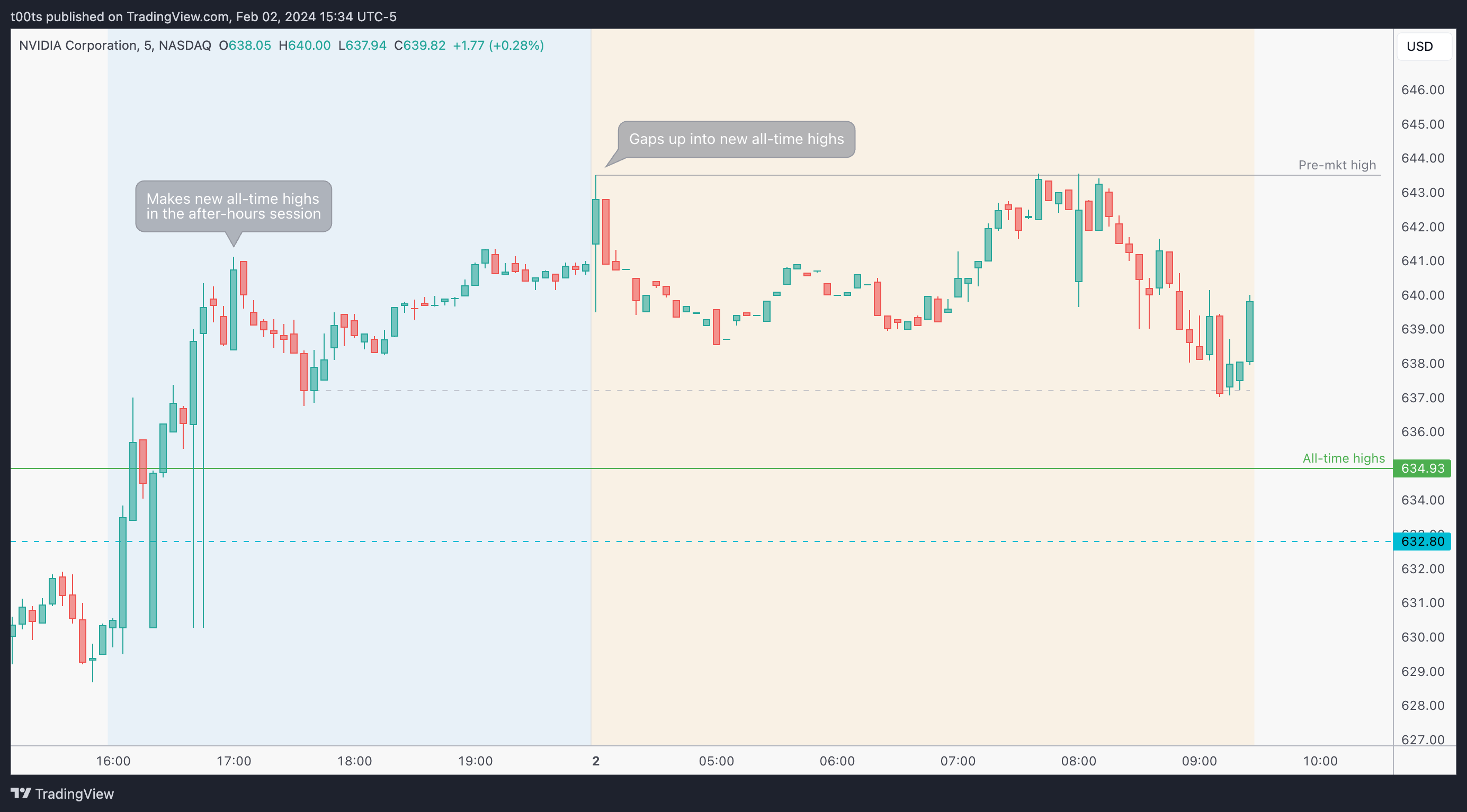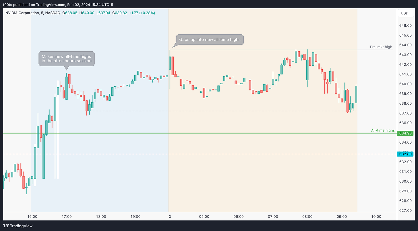Here's where things get interesting. Notice how the stock rallies in the after-hours session and makes new all-time highs. Despite other stocks supposedly having most of the attention given their earnings reports, Nvidia is still climbing to new highs on their announcements. Just like we saw with SMCI, when a stock makes a significant move in the after-hours session it's likely to be in many traders watchlists the following day.