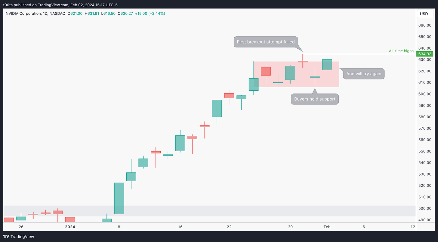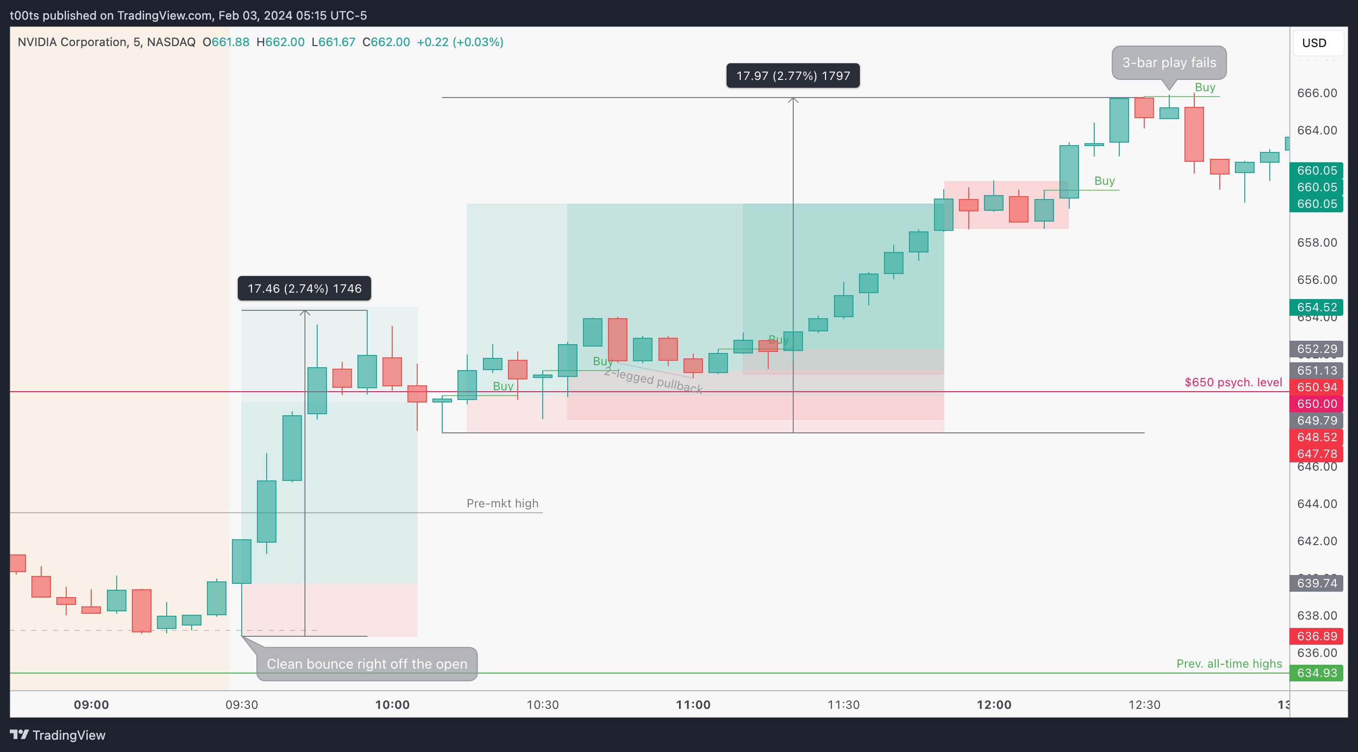 There were several buy setups to take on this consolidation before the next leg up. They offered between 3R and 5R. Again, worth taking. I used $660 as target to be conservative. There was really no reason to sell but as we know those round numbers often act as levels, especially when a stock is in price discovery mode.