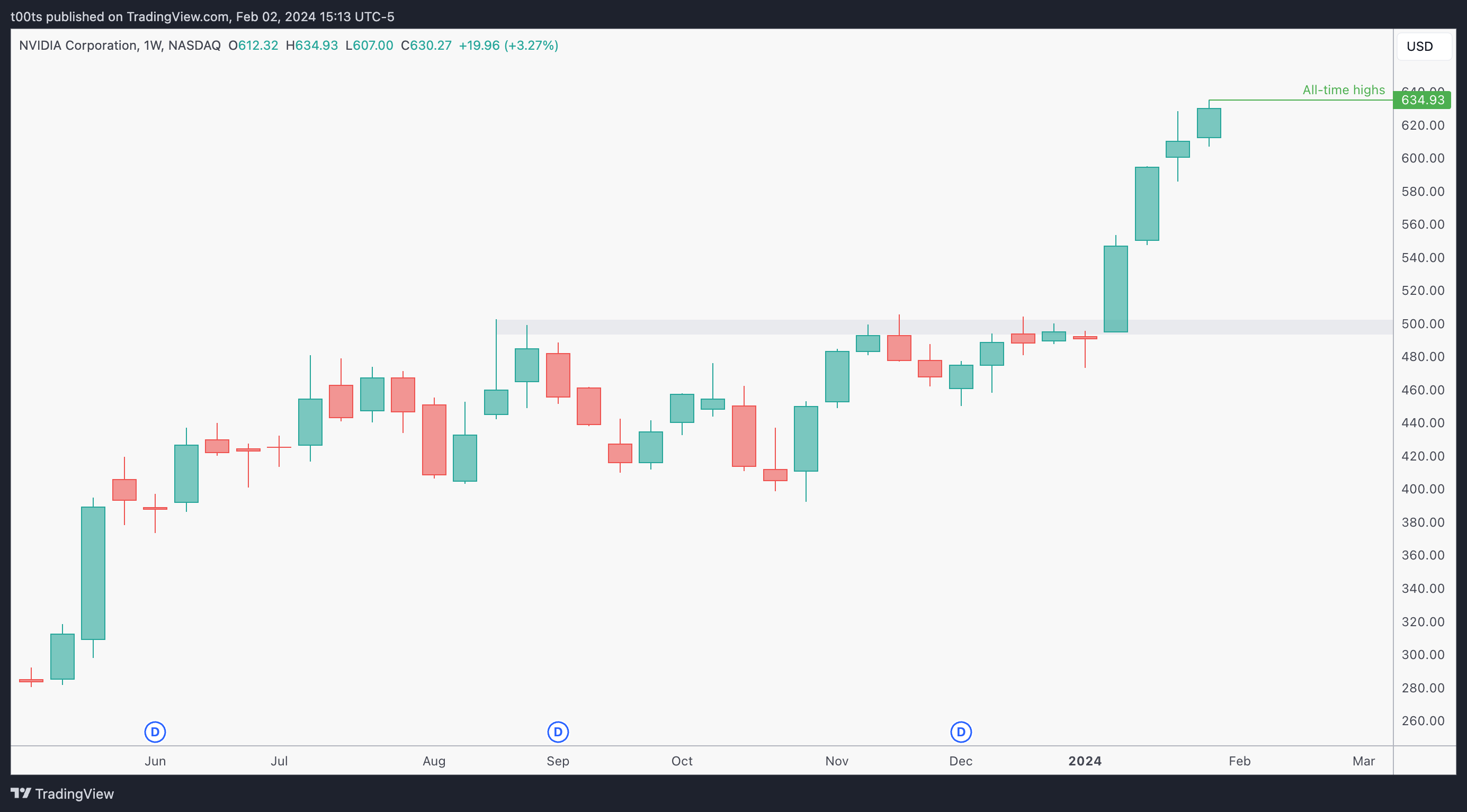Not much to highlight on this weekly chart as price action is pretty straightforward to read. The stock has been pushing ever since the $500 area broke out. We never got a retest, showcasing how much momentum this stock has as investors keep piling in.