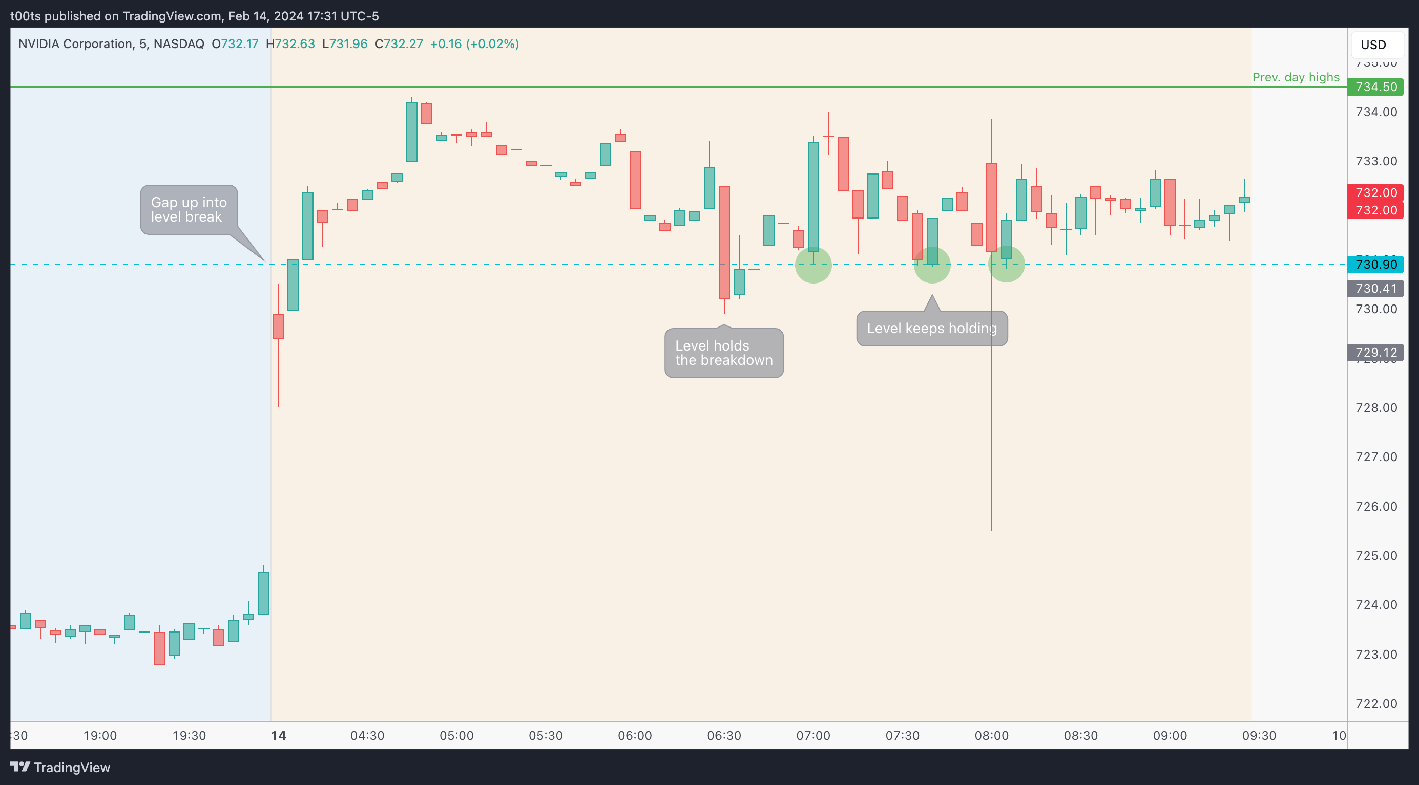 What a beautiful pre-market chart. We get a nice gap up above our level of interest and price consolidates above it, all the way into the open. Note how the level holds every time it gets tested.