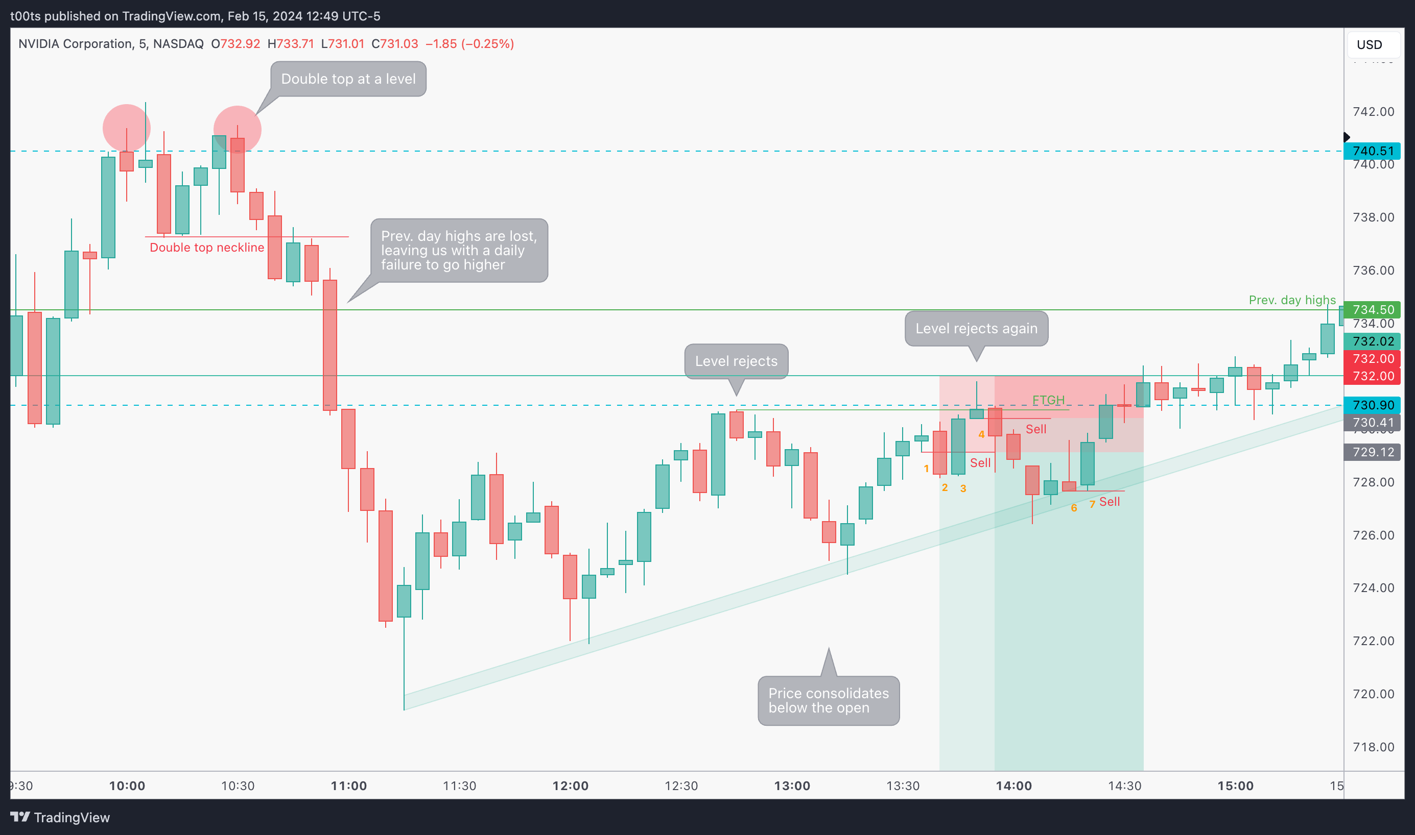 Price pulls back as the $740 area rejects, but bulls give it a second try. They fail again, setting up a potential intraday double top that will eventually trigger a few bars later.
