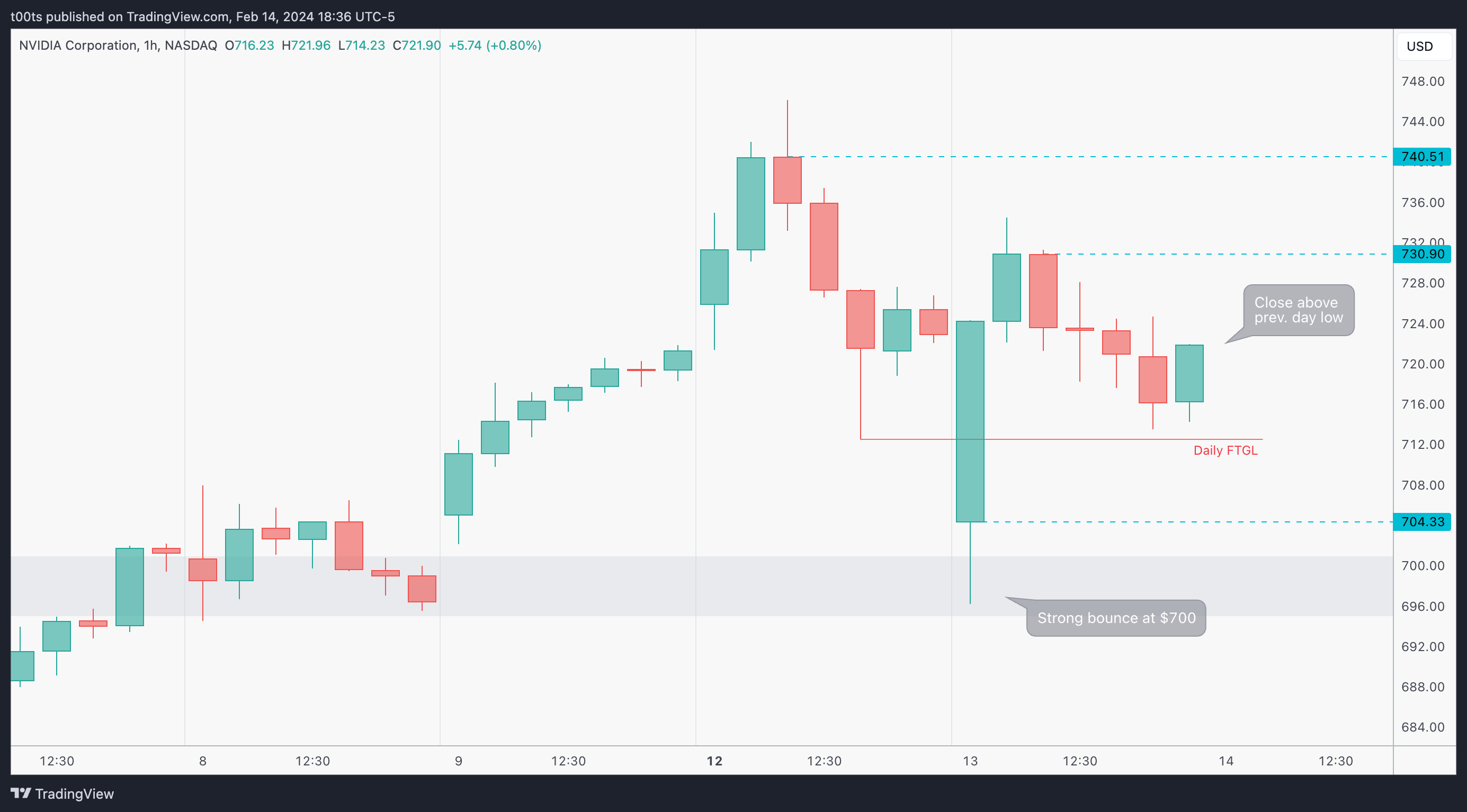 Price is currently in a range, although the keen eye might have observed there's technically a daily failure to go lower on that strong CPI bounce, as price closed above the prev. day's lows. This was not obvious in the daily chart, but is certainly very interesting to note because it paves the way for a clear long from $730.90 to $740.51. Both of these levels are near round numbers, so we can count on more eyes if they do trade.
