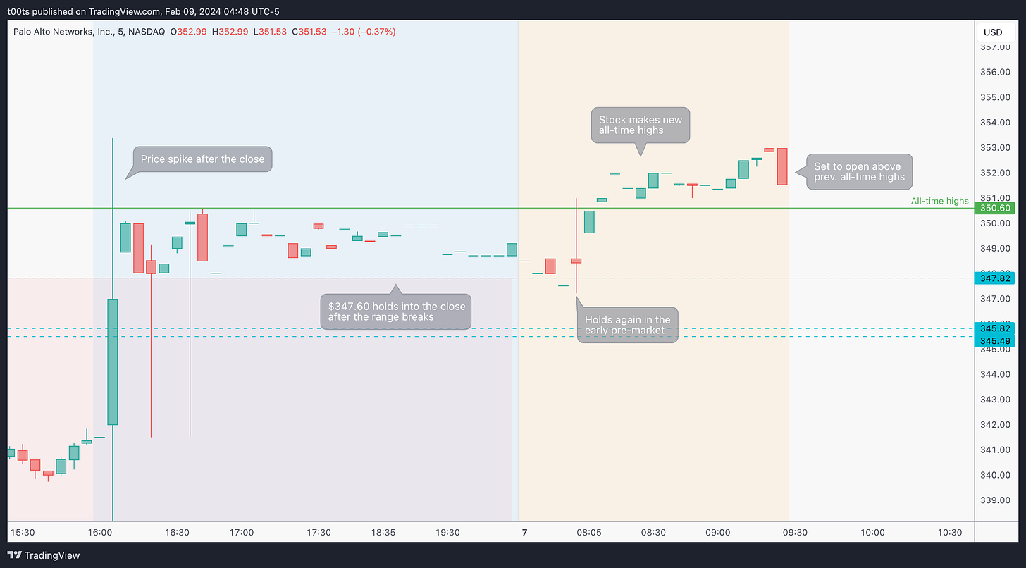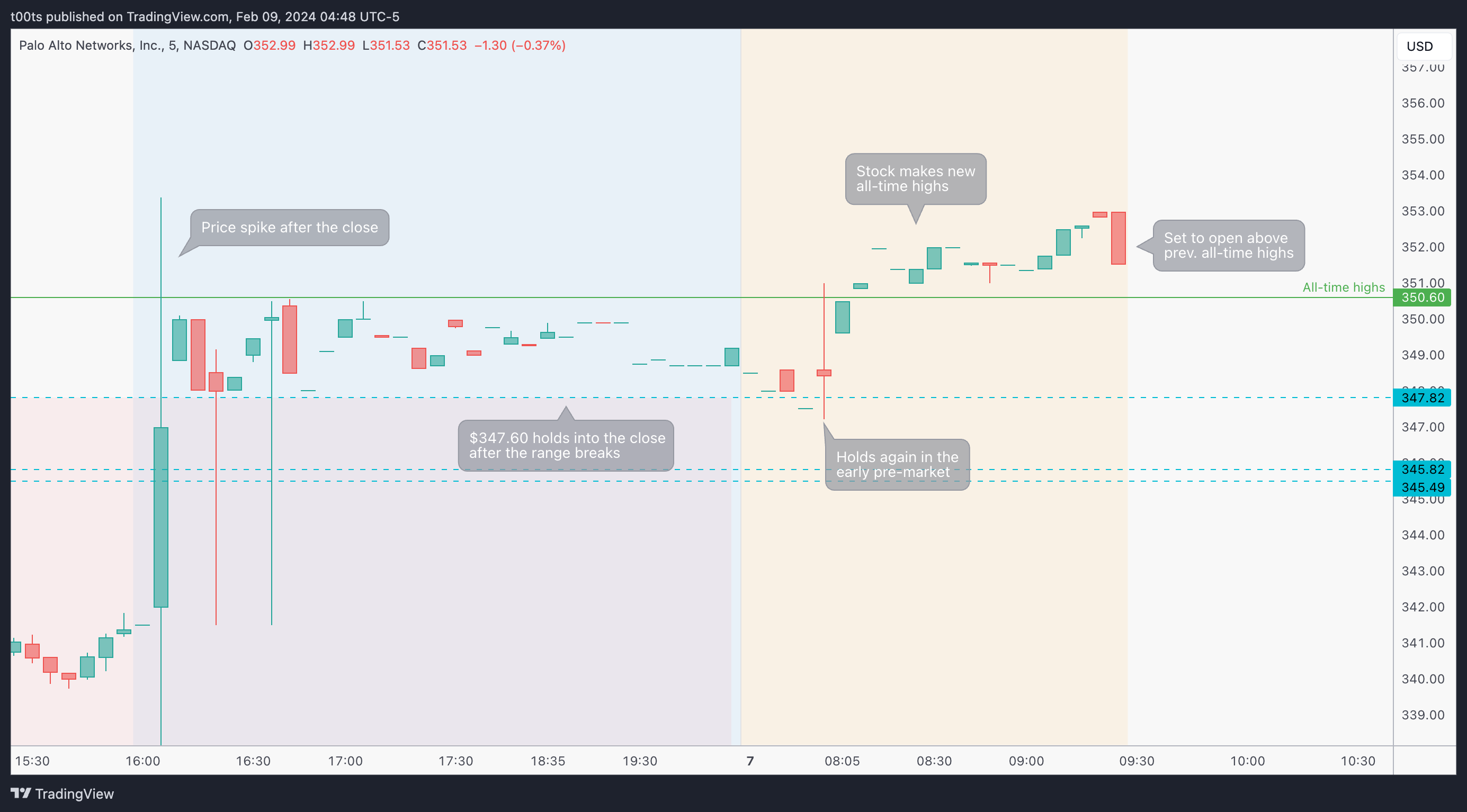 Price breaks out of the range in the after hours and our $347.82 level holds all the way into the close.