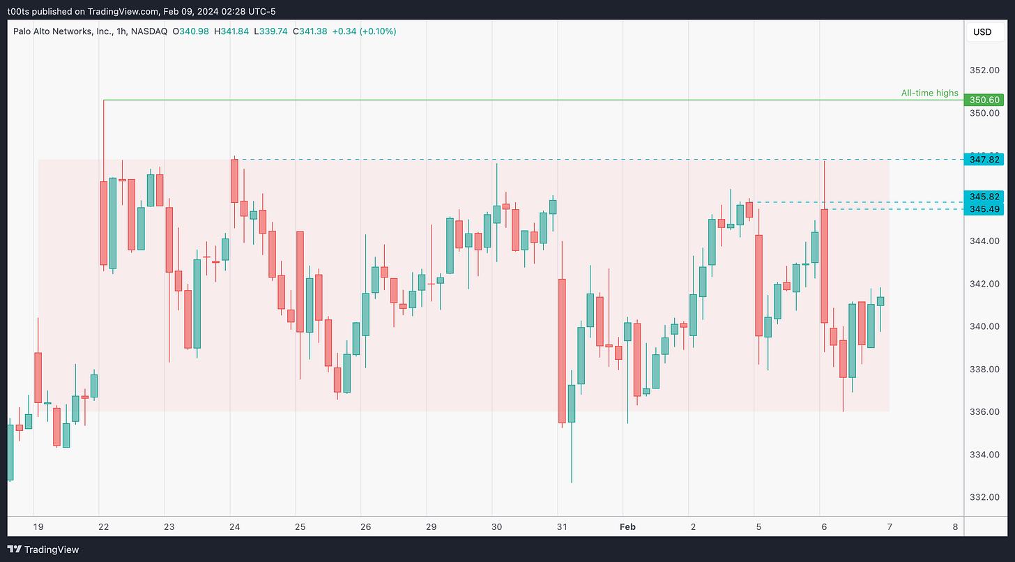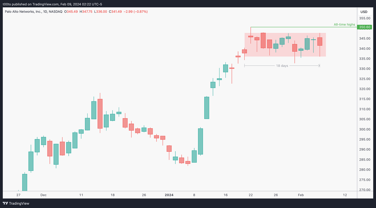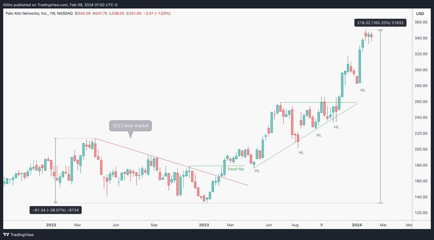 When a stock holds well during a market-wide pullback, expect it to lead and outperform when the trend resumes. This is an apparently obvious concept, but most of us don't seem to give it the importance it deserves. I learned this a while back watching one of Kristjan Kullamägi's streams and it stuck with me. It was simple and easy to understand. In trading, simple and easy can take you very far. Palo Alto Networks is a great example of that concept in practice. That weekly chart we saw above speaks volumes of how well this played out.