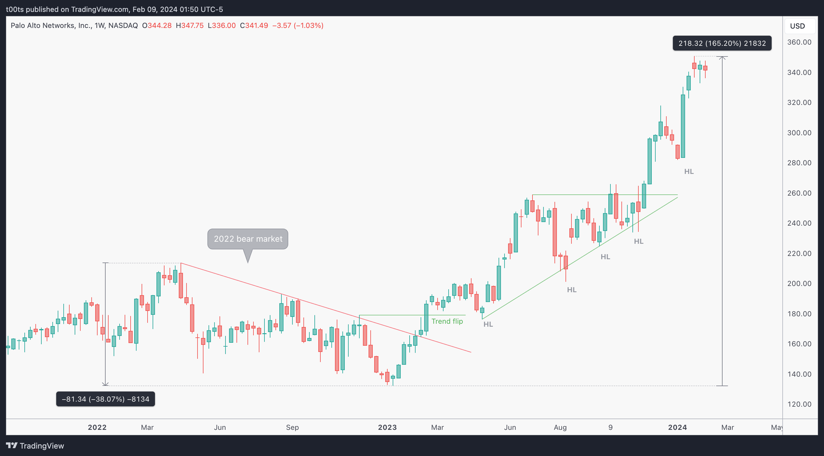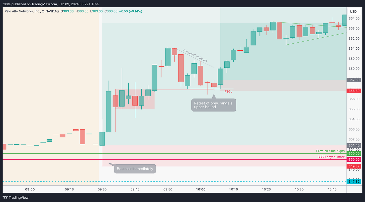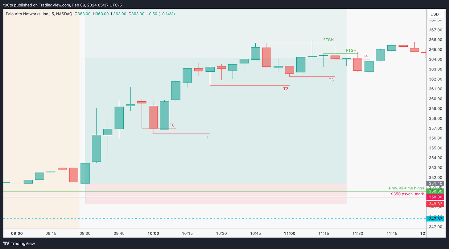 When a stock holds well during a market-wide pullback, expect it to lead and outperform when the trend resumes. This is an apparently obvious concept, but most of us don't seem to give it the importance it deserves. I learned this a while back watching one of Kristjan Kullamägi's streams and it stuck with me. It was simple and easy to understand. In trading, simple and easy can take you very far. Palo Alto Networks is a great example of that concept in practice. That weekly chart we saw above speaks volumes of how well this played out.
