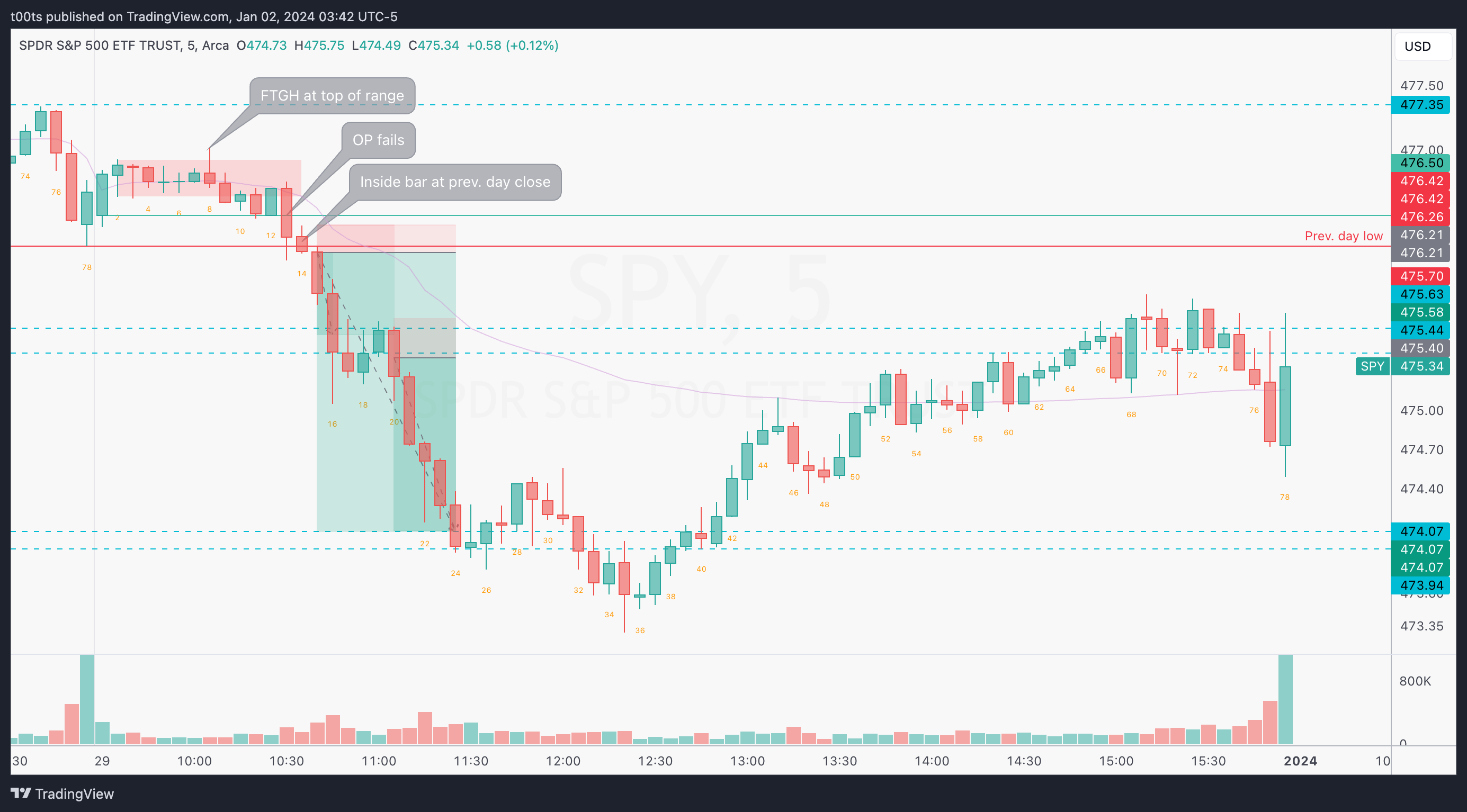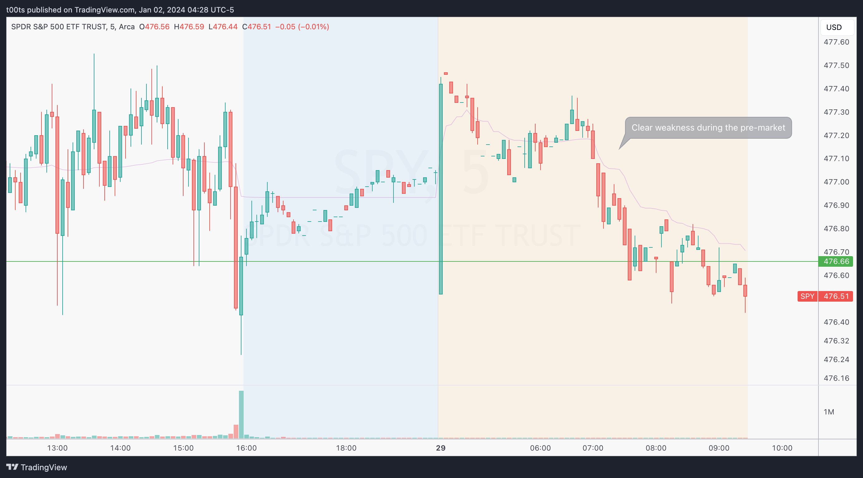 I don't usually trade SPY that much, especially on an expected low-volume day, but this pre-market action would catch my attention. The overnight gap fails to hold, leading to a pre-market downtrend that takes us right into market open.