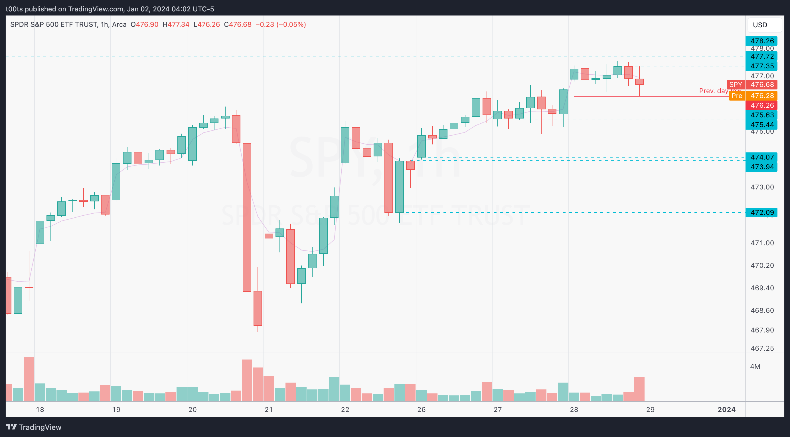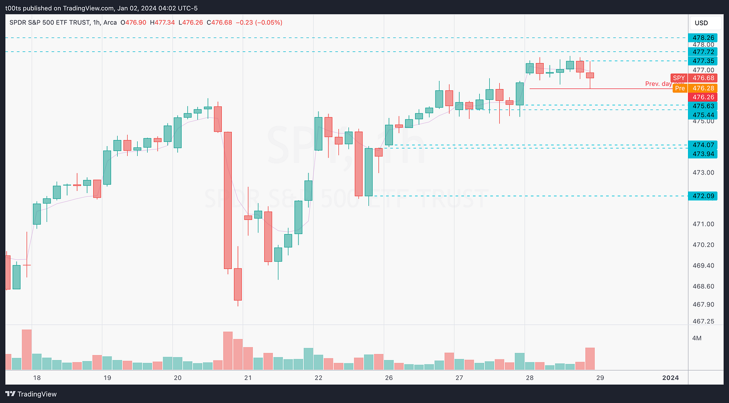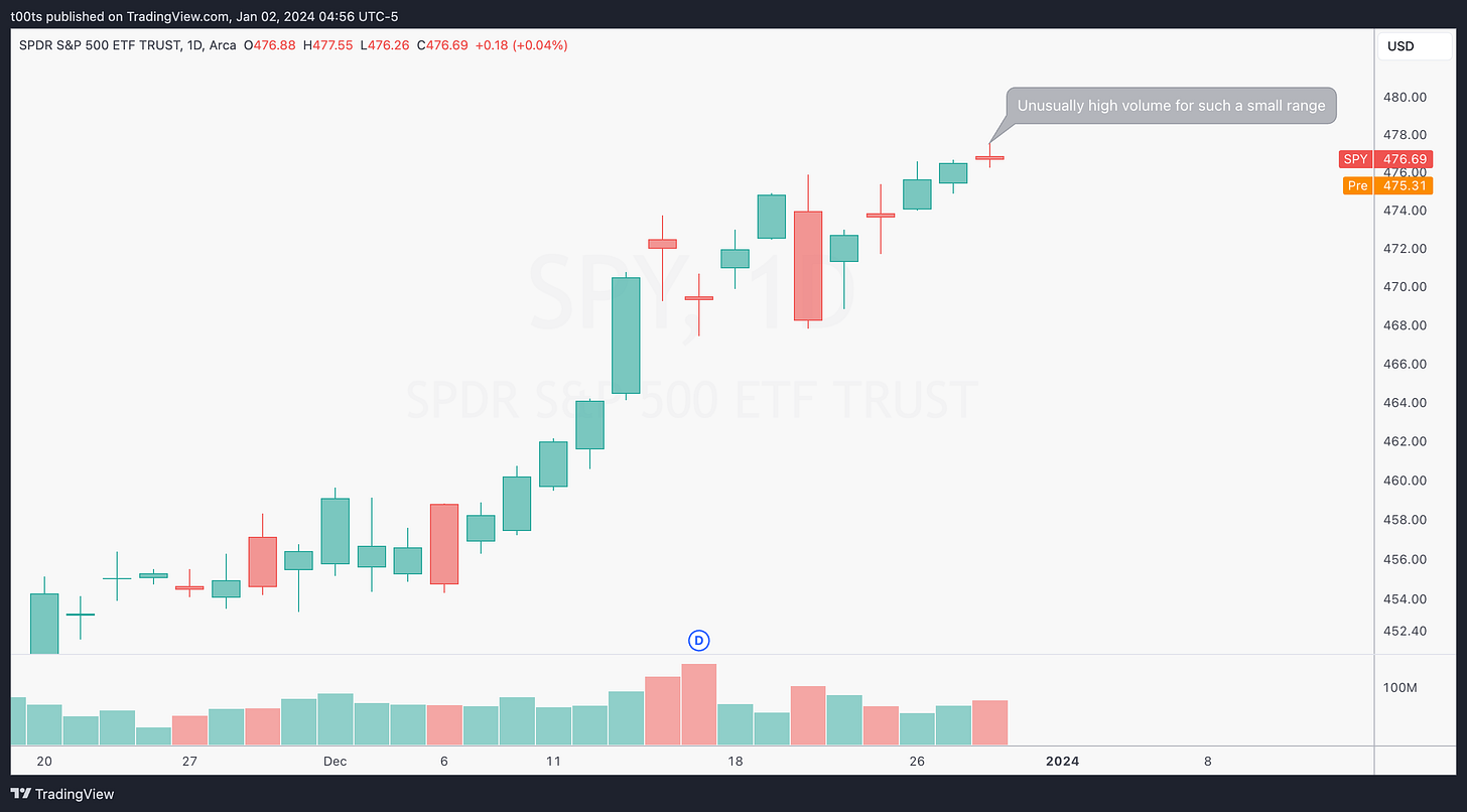 SPY has been on an absolute melt-up for the past 8 weeks. So far we haven't seen any decent pullbacks. It's also the last day of the year so not expecting too much volume. Regardless, yesterday’s daily bar is a small doji with unusually high volume, which makes us consider the possibility of an end-of-year “tax harvesting” dump.