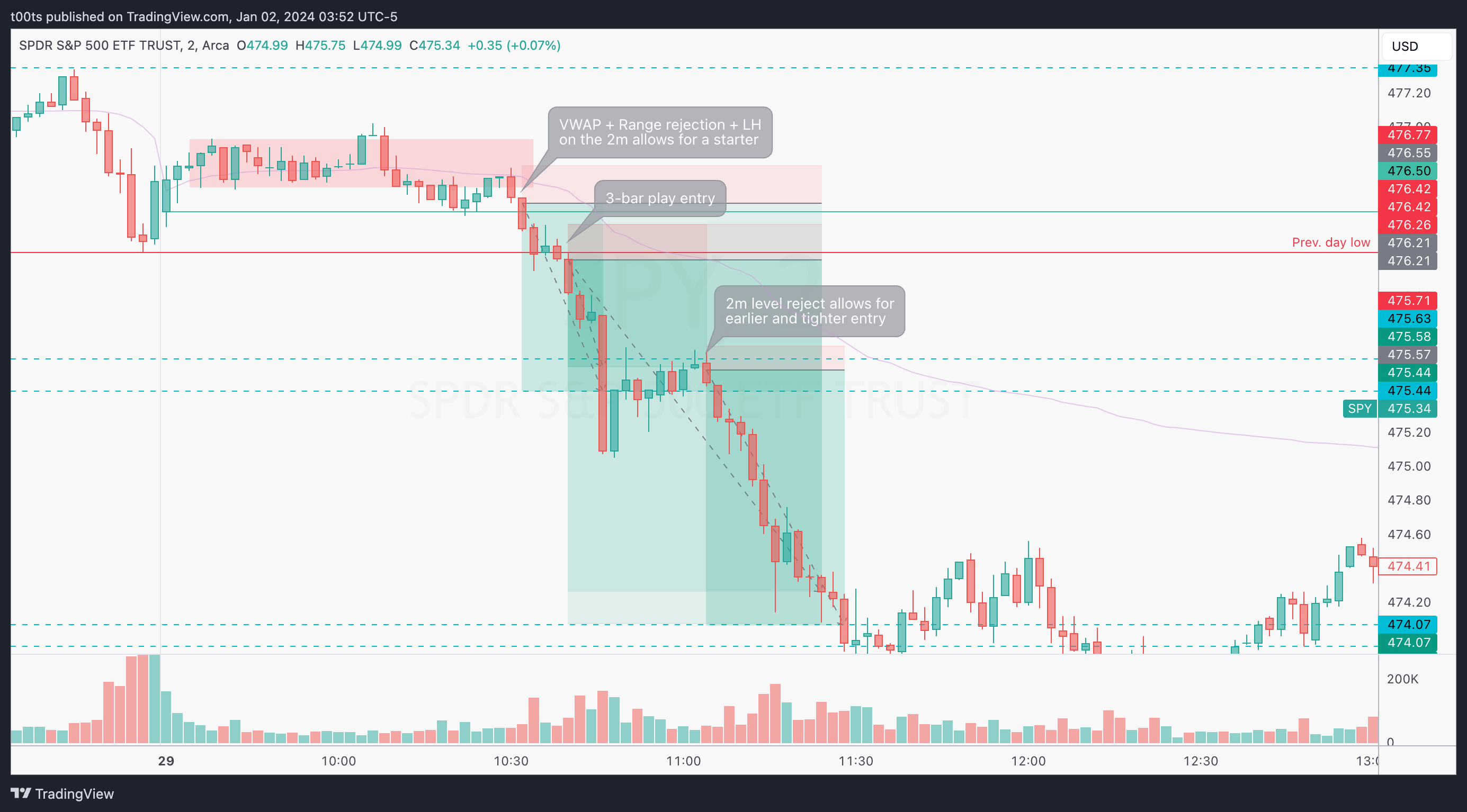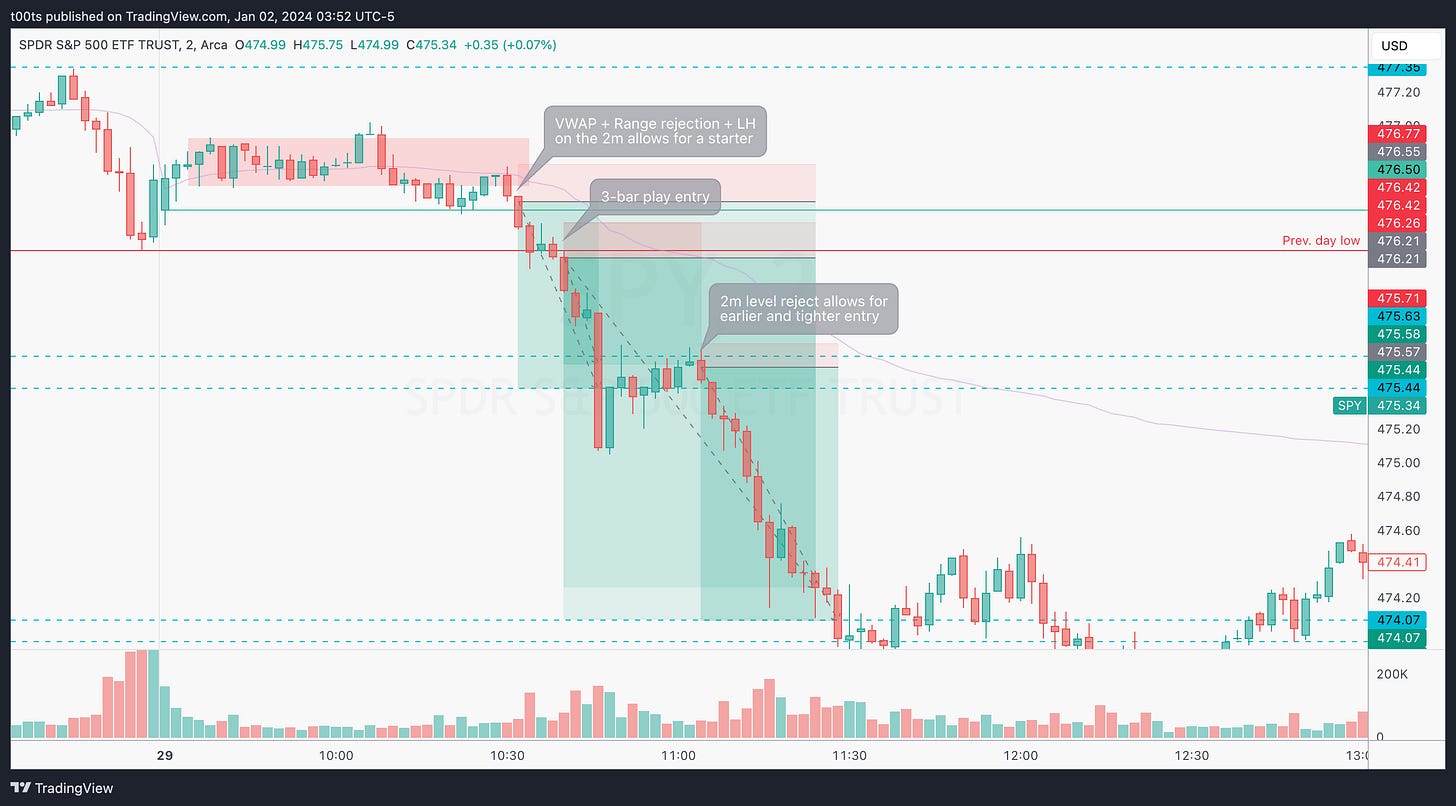 Bar 20 offers a new trade (or a chance to add if we're holding runners), with an entry one tick below Bar 19's low and risking the $475.63 level. If again, we peek at the 2m chart, there is an earlier and tighter entry available that would allow us to put more size.