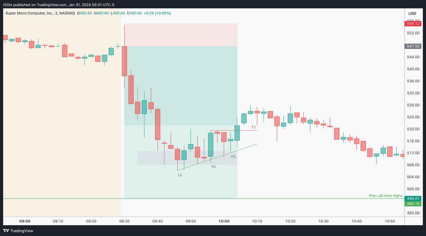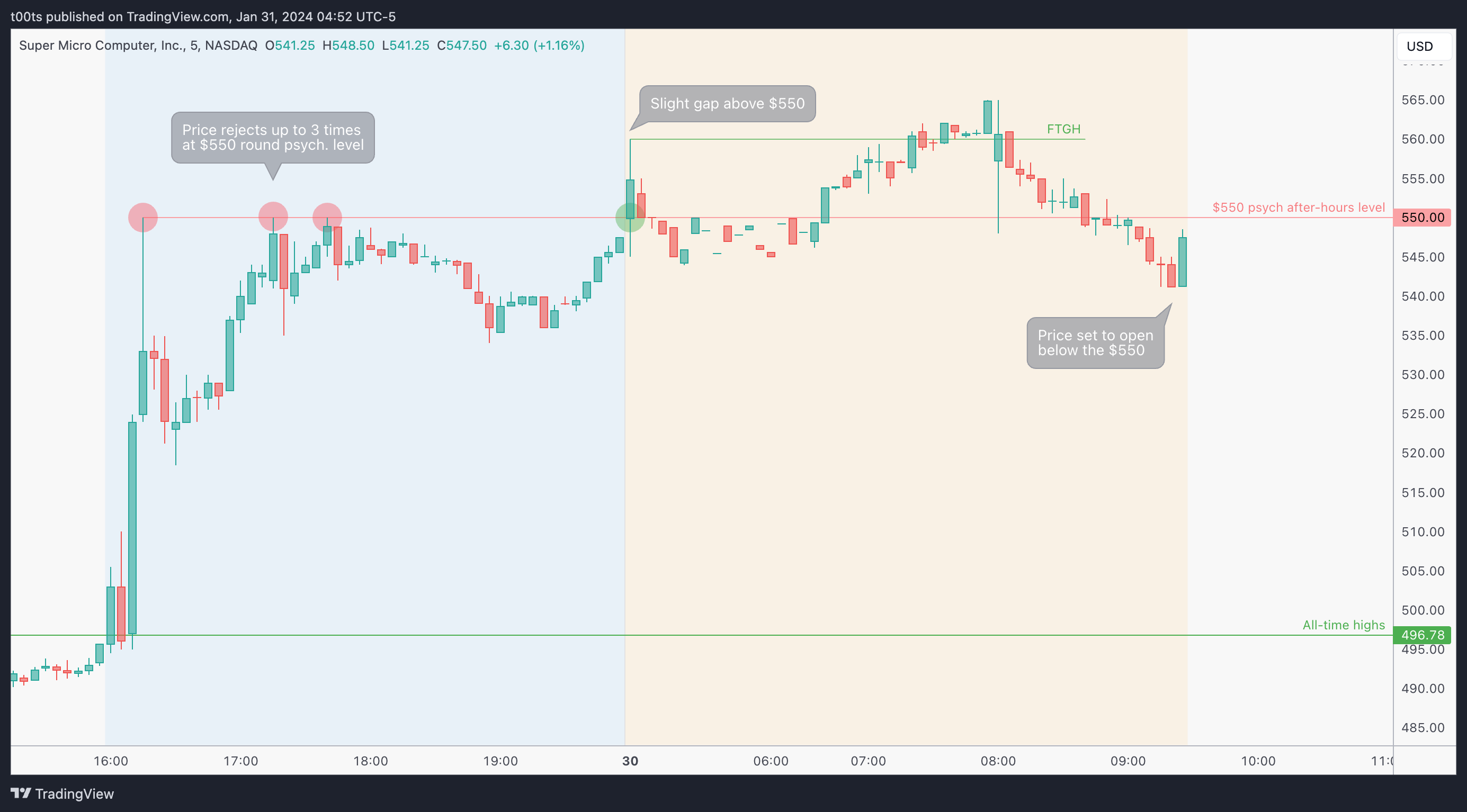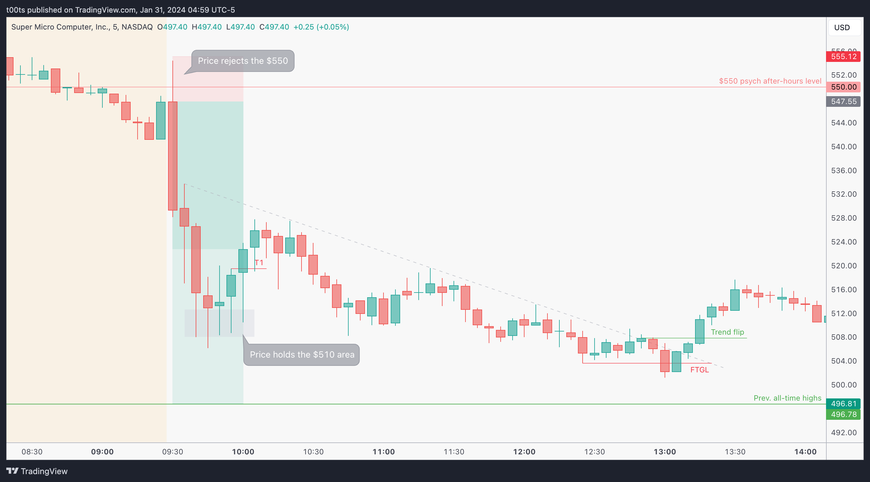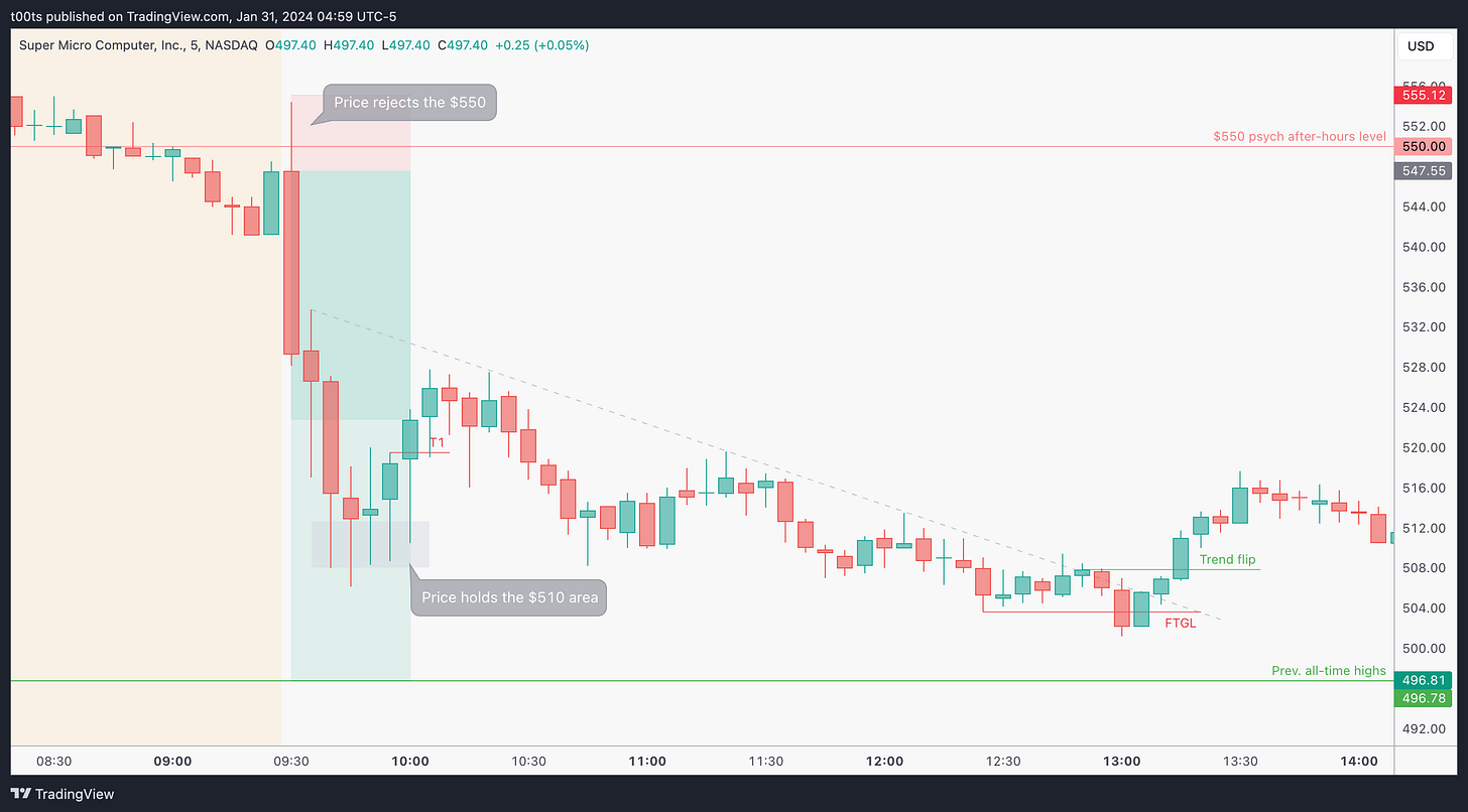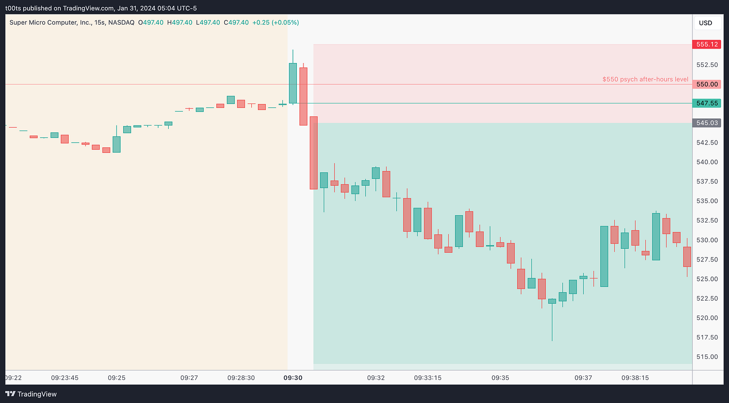 Onto the pre-market session. First thing we see is how price opens right at $550! In the absence of hourly levels, this level is just screaming at us traders as we get ready for the day. Right now it's surely our best reference to gauge where the stock will head next. SMCI climbs up during the pre-market session until it eventually tops around $565 and the trend turns enough for price to lose the $550 completely, as it sets to open below this key level.