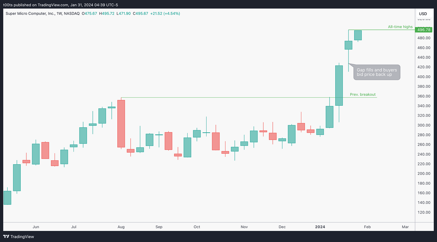 In our previous SMCI post we went over how this recent multi-week breakout had kicked off. Today we're solely focusing on the recent action leading to their earnings release.