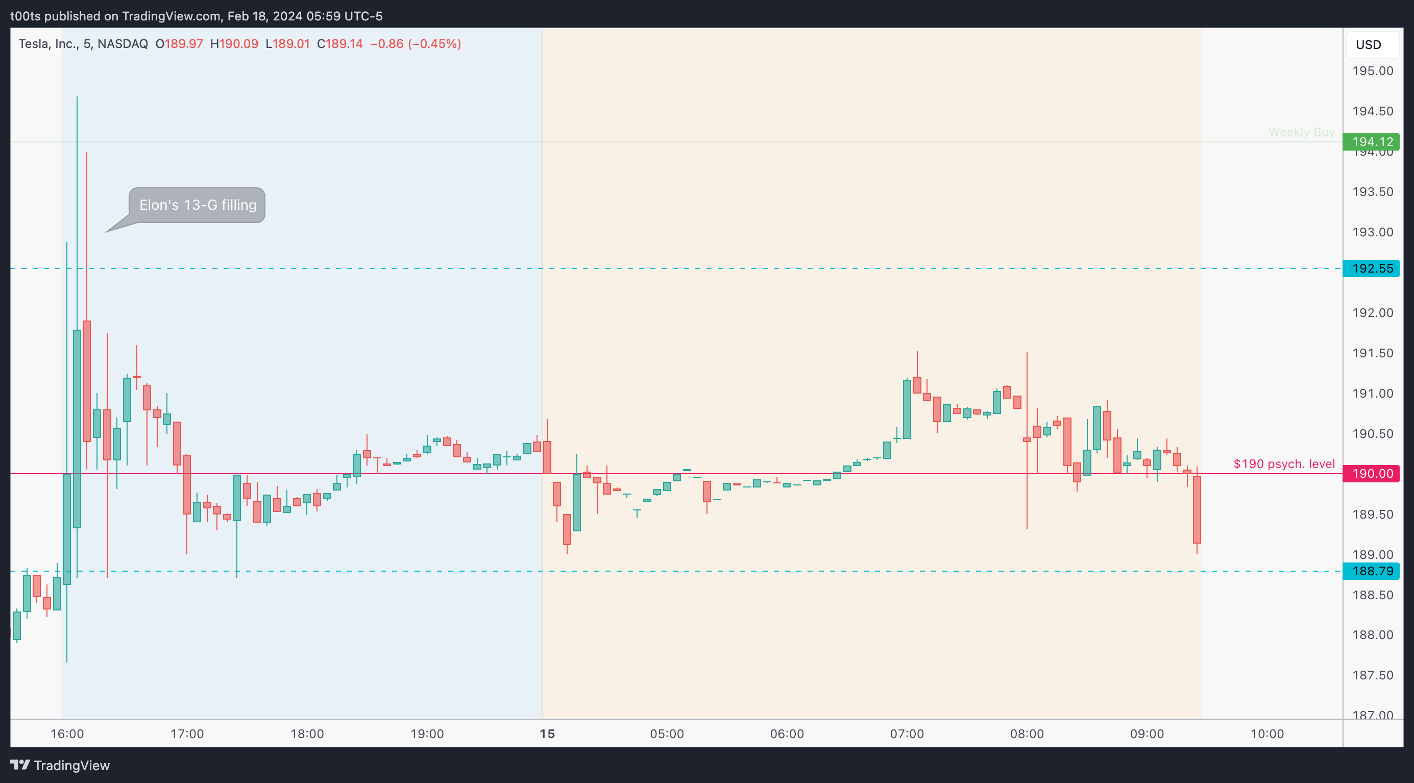 Notice the spike in after-hours leading to today's session. A 13-G filling filed after the close and led to a lot of confusion with regard to Elon increasing his stake in the company from 13% to 20%, which was finally not the case. Nevertheless, this surely brought some attention to the stock on the following day.