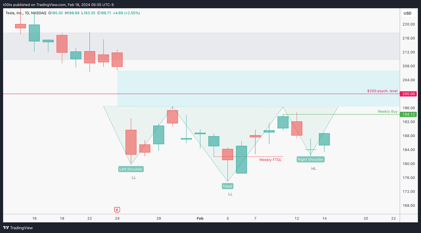 I'm not a pattern guy. I rarely if ever trade off patterns, but this one stood out to me and I figured it was worth highlighting. TSLA's daily action looks like an inverse head & shoulders formation, which is generally bullish. There's also an unfilled earnings gap above which could act as a magnet for price.